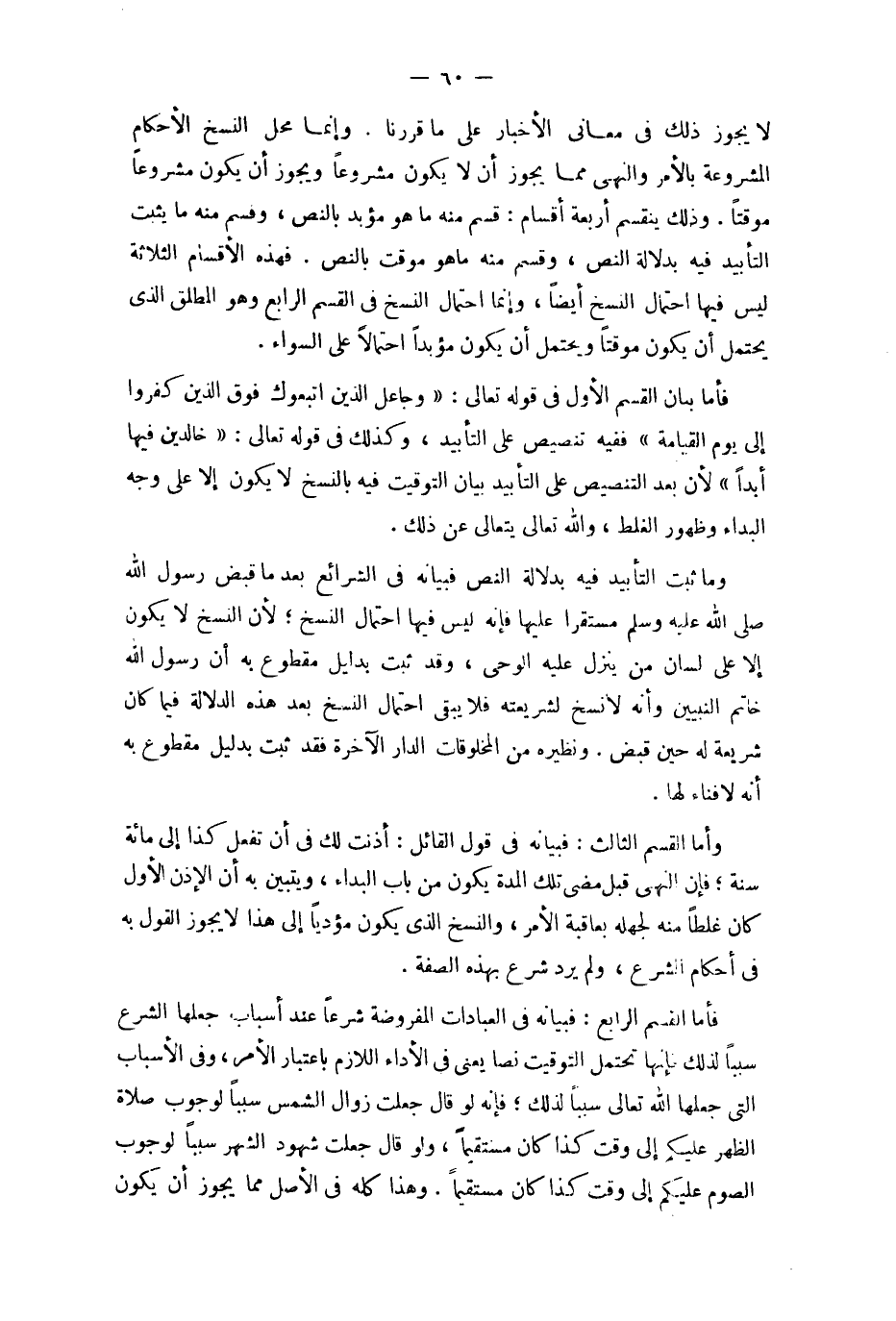 فَهَذِهِ الْأَقْسَام الثَّلَاثَة لَيْسَ فِيهَا احْتِمَال النّسخ أَيْضا وَإِنَّمَا احْتِمَال النّسخ فِي الْقسم الرَّابِع وَهُوَ الْمُطلق الَّذِي يحْتَمل أَن يكون موقتا وَيحْتَمل أَن يكون مُؤَبَّدًا احْتِمَالا على السوَاء