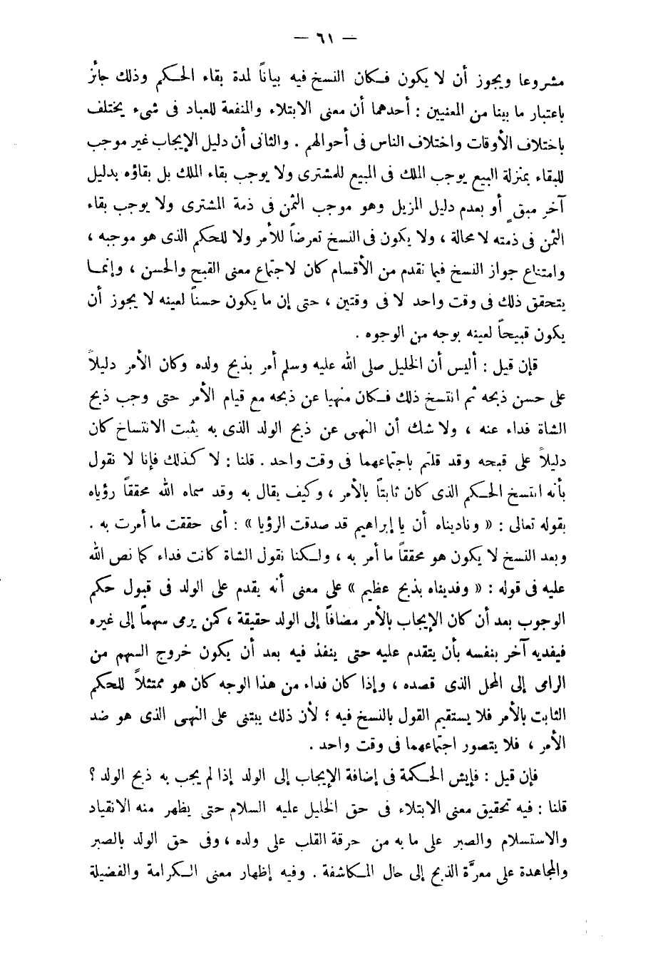 فَإِن قيل أَلَيْسَ أَن الْخَلِيل صلى الله عَلَيْهِ وَسلم أَمر بِذبح وَلَده وَكَانَ الْأَمر دَلِيلا على حسن ذبحه ثمَّ انتسخ ذَلِك فَكَانَ مَنْهِيّا عَن ذبحه مَعَ قيام الْأَمر حَتَّى وَجب ذبح الشَّاة فدَاء عَنهُ وَلَا شكّ أَن النَّهْي عَن ذبح الْوَلَد الَّذِي بِهِ يثبت الانتساخ كَانَ دَلِيلا على قبحه وَقد قُلْتُمْ باجتماعهما فِي وَقت وَاحِد