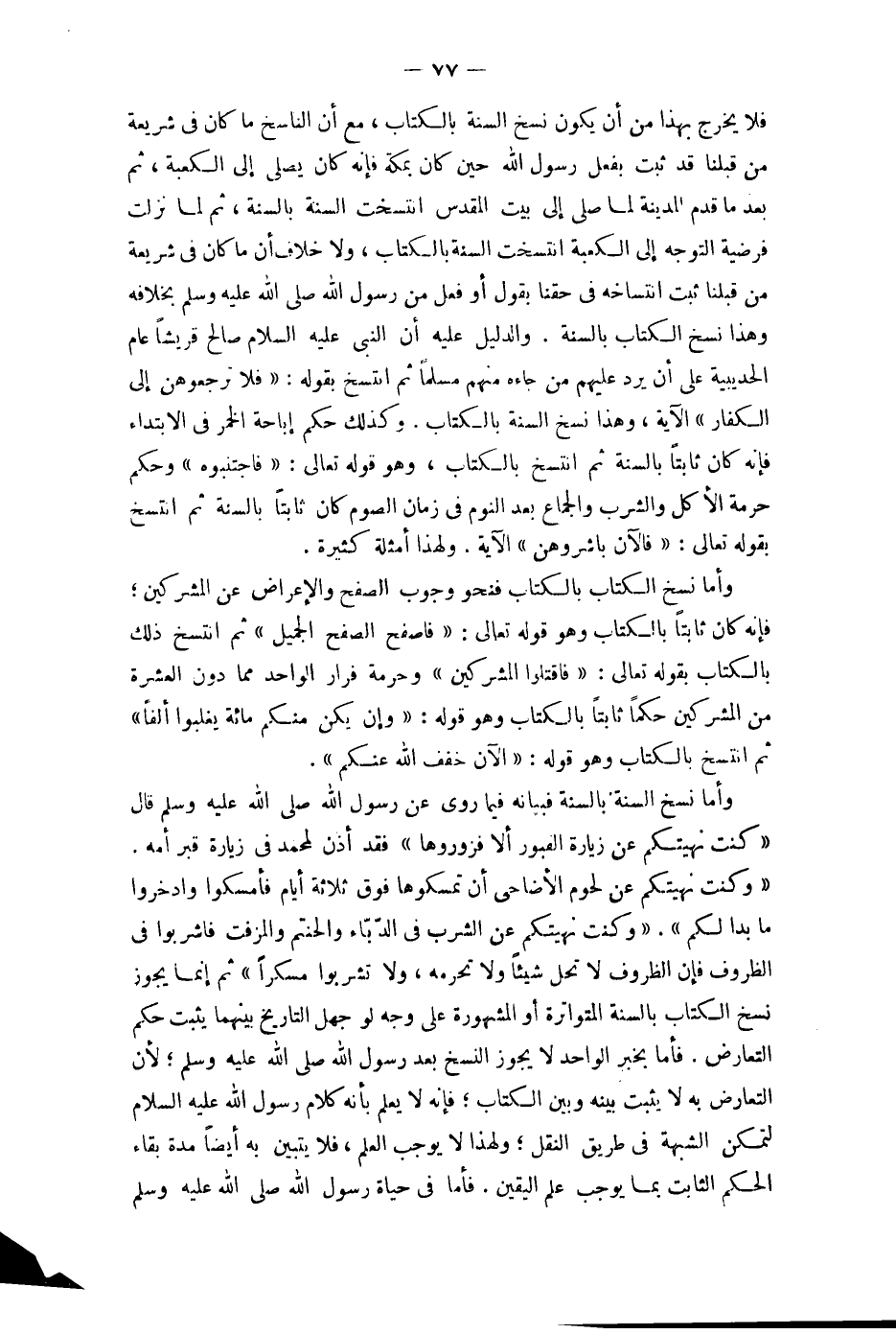 وَأما نسخ السّنة بِالسنةِ فبيانه فِيمَا رُوِيَ عَن رَسُول الله صلى الله عَلَيْهِ وَسلم قَالَ كنت نَهَيْتُكُمْ عَن زِيَارَة الْقُبُور أَلا فزوروها فقد أذن لمُحَمد فِي زِيَارَة قبر أمه