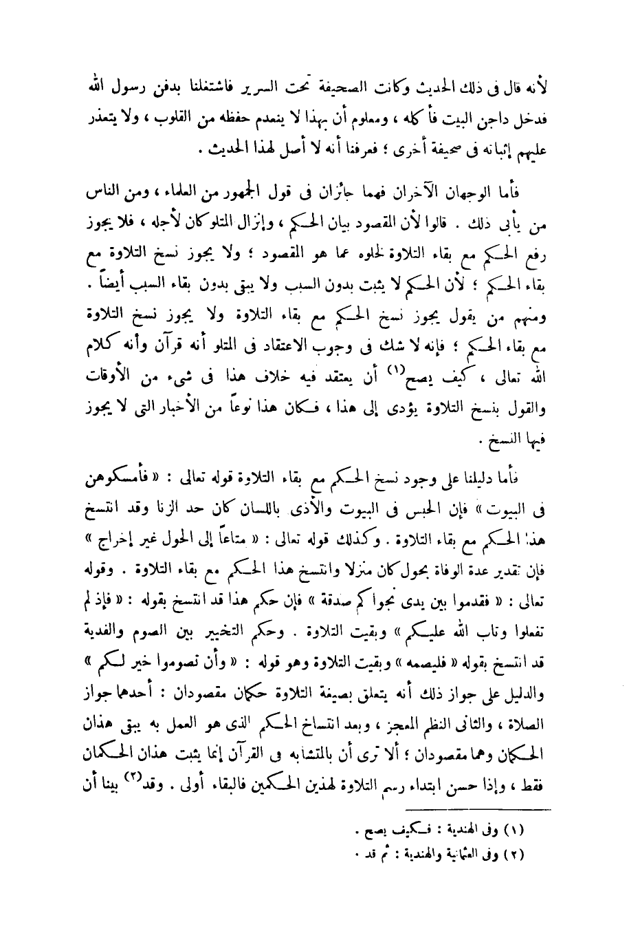 فَأَما دليلنا على وجود نسخ الحكم مَعَ بَقَاء التِّلَاوَة قَوْله تَعَالَى {فأمسكوهن فِي الْبيُوت} فَإِن الْحَبْس فِي الْبيُوت والأذى بِاللِّسَانِ كَانَ حد الزِّنَا وَقد انتسخ هَذَا الحكم مَعَ بَقَاء التِّلَاوَة