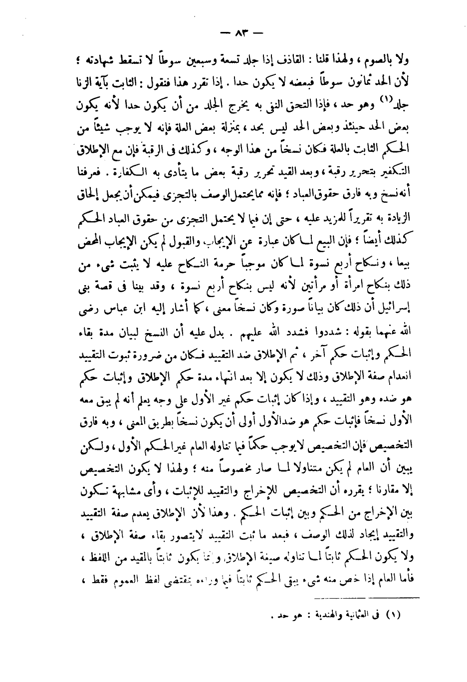 إِذا تقرر هَذَا فَنَقُول الثَّابِت بِآيَة الزِّنَا جلد وَهُوَ حد فَإِذا الْتحق النَّفْي بِهِ يخرج الْجلد من أَن يكون حدا لِأَنَّهُ يكون بعض الْحَد حِينَئِذٍ وَبَعض الْحَد لَيْسَ بِحَدّ بِمَنْزِلَة بعض الْعلَّة فَإِنَّهُ لَا يُوجب شَيْئا من الحكم الثَّابِت بِالْعِلَّةِ فَكَانَ نسخا من هَذَا الْوَجْه وَكَذَلِكَ فِي الرَّقَبَة فَإِن مَعَ الْإِطْلَاق التَّكْفِير بتحرير رَقَبَة وَبعد الْقَيْد تَحْرِير رَقَبَة بعض مَا يتَأَدَّى بِهِ الْكَفَّارَة