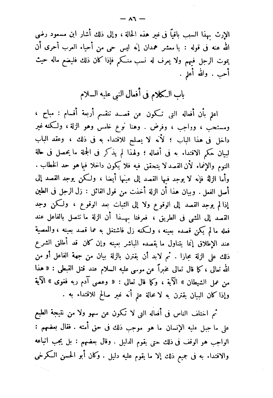 بَاب الْكَلَام فِي أَفعَال النَّبِي عَلَيْهِ السَّلَام