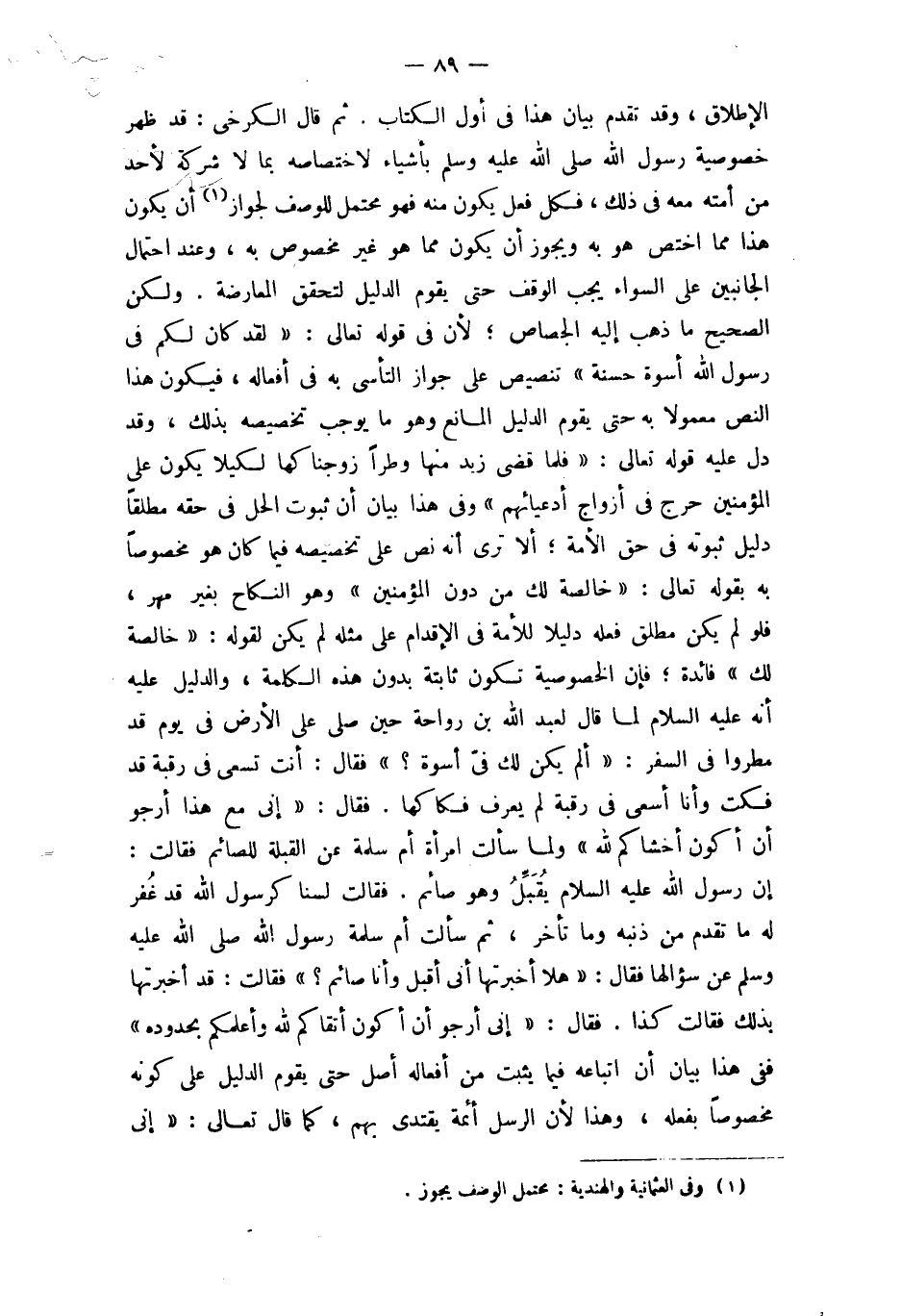 وَلَكِن الصَّحِيح مَا ذهب إِلَيْهِ الْجَصَّاص لِأَن فِي قَوْله تَعَالَى {لقد كَانَ لكم فِي رَسُول الله أُسْوَة حَسَنَة} تنصيص على جَوَاز التأسي بِهِ فِي أَفعاله فَيكون هَذَا النَّص مَعْمُولا بِهِ حَتَّى يقوم الدَّلِيل الْمَانِع وَهُوَ مَا يُوجب تَخْصِيصه بذلك وَقد دلّ عَلَيْهِ قَوْله تَعَالَى {فَلَمَّا قضى زيد مِنْهَا وطرا زَوَّجْنَاكهَا لكَي لَا يكون على الْمُؤمنِينَ حرج فِي أَزوَاج أدعيائهم} وَفِي هَذَا بَيَان أَن ثُبُوت الْحل فِي حَقه مُطلقًا دَلِيل ثُبُوته فِي حق الْأمة أَلا ترى أَنه نَص على تَخْصِيصه فِيمَا كَانَ هُوَ مَخْصُوصًا بِهِ بقوله تَعَالَى {خَالِصَة لَك من دون الْمُؤمنِينَ} وَهُوَ النِّكَاح بِغَيْر مهر فَلَو لم يكن مُطلق فعله دَلِيلا للْأمة فِي الْإِقْدَام على مثله لم يكن لقَوْله {خَالِصَة لَك} فَائِدَة فَإِن الخصوصية تكون ثَابِتَة بِدُونِ هَذِه الْكَلِمَة وَالدَّلِيل عَلَيْهِ أَنه عَلَيْهِ السَّلَام لما قَالَ لعبد الله بن رَوَاحَة حِين صلى على الأَرْض فِي يَوْم قد مُطِرُوا فِي السّفر ألم يكن لَك فِي أُسْوَة فَقَالَ أَنْت تسْعَى فِي رَقَبَة قد فكت وَأَنا أسعى فِي رَقَبَة لم يعرف فكاكها