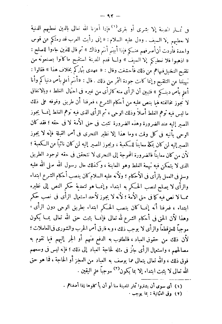 قَالَ أَنْتُم أعلم بِأَمْر دنياكم وَأَنا أعلم بِأَمْر دينكُمْ فَتبين أَن الرَّأْي مِنْهُ كالرأي من غَيره فِي احْتِمَال الْغَلَط وبالاتفاق لَا تجوز مُخَالفَته فِيمَا ينص عَلَيْهِ من أَحْكَام الشَّرْع فَعرفنَا أَن طَرِيق وُقُوفه على ذَلِك مَا لَيْسَ فِيهِ توهم الْغَلَط أصلا وَذَلِكَ الْوَحْي ثمَّ الرَّأْي الَّذِي فِيهِ توهم الْغَلَط إِنَّمَا يجوز الْمصير إِلَيْهِ عِنْد الضَّرُورَة وَهَذِه الضَّرُورَة تثبت فِي حق الْأمة لَا فِي حَقه فقد كَانَ الْوَحْي يَأْتِيهِ فِي كل وَقت وَمَا هَذَا إِلَّا نَظِير التَّحَرِّي فِي أَمر الْقبْلَة فَإِنَّهُ لَا يجوز الْمصير إِلَيْهِ لمن كَانَ بِمَكَّة معاينا للكعبة وَيجوز الْمصير إِلَيْهِ لمن كَانَ نَائِيا عَن الْكَعْبَة لِأَن من كَانَ معاينا فالضرورة المحوجة إِلَى التَّحَرِّي لَا تتَحَقَّق فِي حَقه لوُجُود الطَّرِيق الَّذِي لَا يتَمَكَّن فِيهِ تُهْمَة الْغَلَط وَهُوَ المعاينة وَكَذَلِكَ حَال رَسُول الله صلى الله عَلَيْهِ وَسلم فِي الْعَمَل بِالرَّأْيِ فِي الْأَحْكَام وَلِأَنَّهُ عَلَيْهِ السَّلَام كَانَ ينصب أَحْكَام الشَّرْع ابْتِدَاء والرأي لَا يصلح لنصب الحكم بِهِ ابْتِدَاء وَإِنَّمَا هُوَ لتعدية حكم النَّص إِلَى نَظِيره مِمَّا لَا نَص فِيهِ كَمَا فِي حق الْأمة لِأَنَّهُ لَا يجوز لأحد اسْتِعْمَال الرَّأْي فِي نصب حكم ابْتِدَاء فَعرفنَا أَنه إِنَّمَا كَانَ ينصب الحكم ابْتِدَاء بطرِيق الْوَحْي دون الرَّأْي وَهَذَا لِأَن الْحق فِي أَحْكَام الشَّرْع لله تَعَالَى فَإِنَّمَا يثبت حق الله تَعَالَى بِمَا يكون مُوجبا للْعلم قطعا والرأي لَا يُوجب ذَلِك وَبِه فَارق أَمر الْحَرْب والشورى فِي الْمُعَامَلَات لِأَن ذَلِك من حُقُوق الْعباد فالمطلوب بِهِ الدّفع عَنْهُم أَو الْجَرّ إِلَيْهِم فِيمَا تقوم بِهِ مصالحهم وَاسْتِعْمَال الرَّأْي جَائِز فِي مثله لحَاجَة الْعباد إِلَى ذَلِك فَإِنَّهُ لَيْسَ فِي وسعهم فَوق ذَلِك وَالله تَعَالَى يتعالى عَمَّا يُوصف بِهِ الْعباد من الْعَجز أَو الْحَاجة فَمَا هُوَ حق الله تَعَالَى لَا يثبت ابْتِدَاء إِلَّا بِمَا يكون مُوجبا علم الْيَقِين