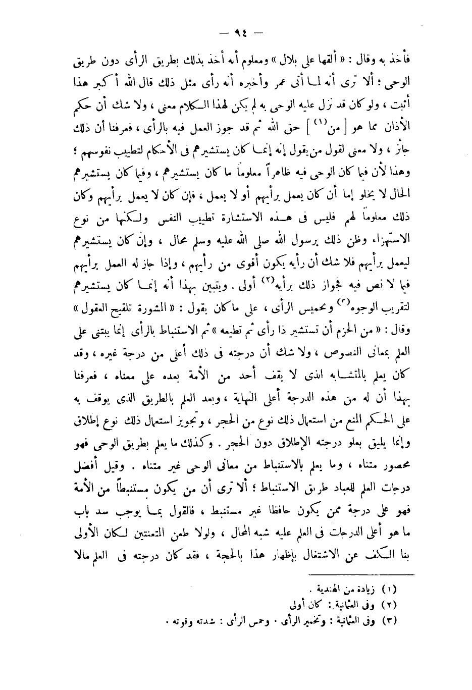 ويتبين بِهَذَا أَنه إِنَّمَا كَانَ يستشيرهم لتقريب الْوُجُوه وتحميس الرَّأْي على مَا كَانَ يَقُول المشورة تلقيح الْعُقُول وَقَالَ من الحزم أَن تستشير ذَا رَأْي ثمَّ تُطِيعهُ ثمَّ الاستنباط بِالرَّأْيِ إِنَّمَا يبتنى على الْعلم بمعاني النُّصُوص وَلَا شكّ أَن دَرَجَته فِي ذَلِك أَعلَى من دَرَجَة غَيره وَقد كَانَ يعلم بالمتشابه الَّذِي لَا يقف أحد من الْأمة بعده على مَعْنَاهُ فَعرفنَا بِهَذَا أَن لَهُ من هَذِه الدرجَة أَعلَى النِّهَايَة وَبعد الْعلم بِالطَّرِيقِ الَّذِي يُوقف بِهِ على الحكم الْمَنْع من اسْتِعْمَال ذَلِك نوع من الْحجر وتجويز اسْتِعْمَال ذَلِك نوع إِطْلَاق وَإِنَّمَا يَلِيق بعلو دَرَجَته الْإِطْلَاق دون الْحجر