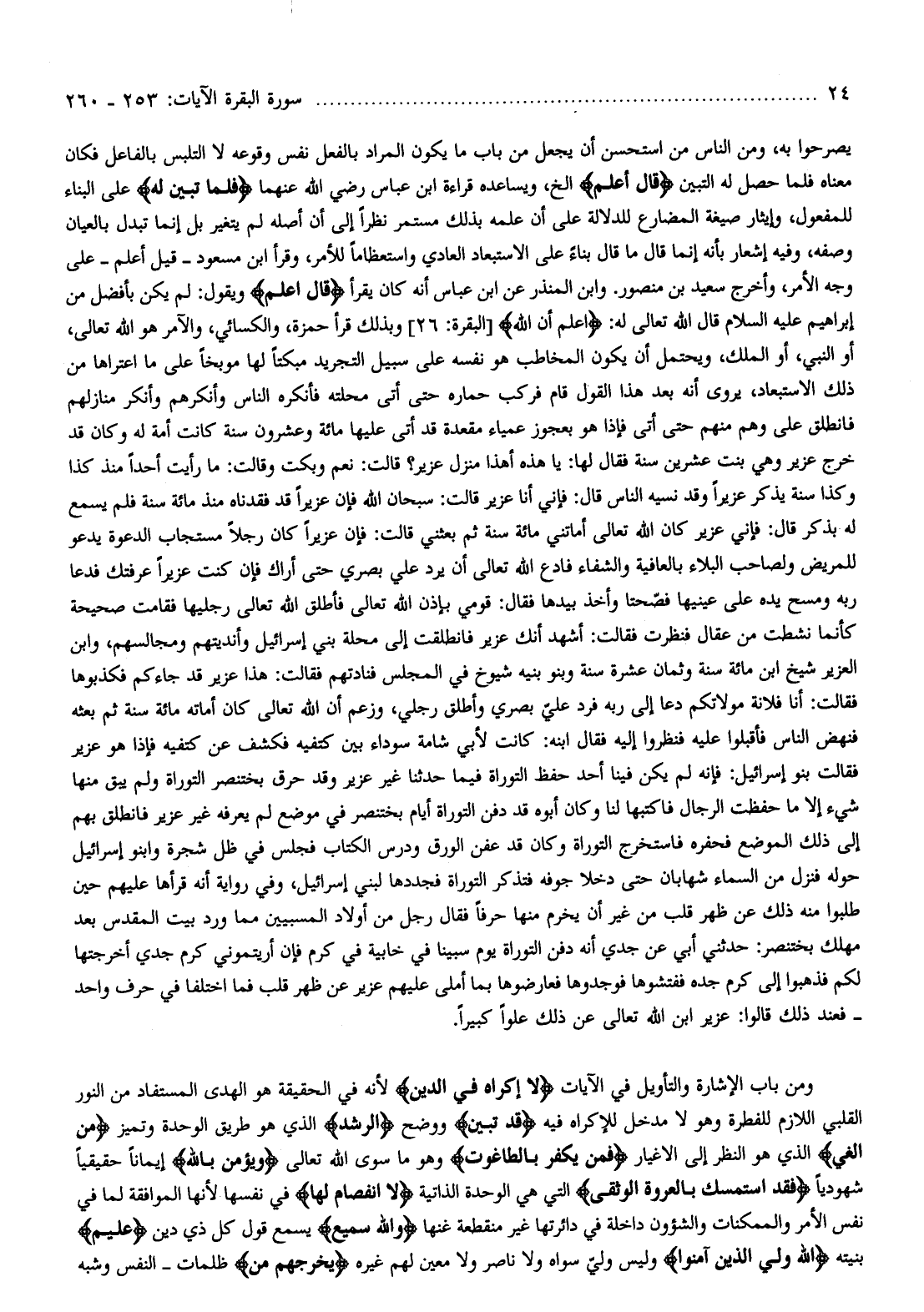ومن باب الإشارة والتأويل في الآيات لا إِكْراهَ فِي الدِّينِ لأنه في الحقيقة هو الهدى المستفاد من النور القلبي اللازم للفطرة وهو لا مدخل للإكراه فيه قَدْ تَبَيَّنَ ووضح الرُّشْدُ الذي هو طريق الوحدة وتميز مِنَ الْغَيِّ الذي هو النظر إلى الأغيار فَمَنْ يَكْفُرْ بِالطَّاغُوتِ وهو ما سوى الله تعالى وَيُؤْمِنْ بِاللَّهِ إيمانا حقيقيا شهوديا فَقَدِ اسْتَمْسَكَ بِالْعُرْوَةِ الْوُثْقى التي هي الوحدة الذاتية لَا انْفِصامَ لَها في نفسها لأنها الموافقة لما في نفس الأمر والممكنات والشؤون داخلة في دائرتها غير منقطعة عنها وَاللَّهُ سَمِيعٌ يسمع قول كل ذي دين عَلِيمٌ بنيته اللَّهُ وَلِيُّ الَّذِينَ آمَنُوا وليس وليّ سواه ولا ناصر ولا معين لهم غيره يُخْرِجُهُمْ مِنَ ظلمات- النفس وشبه