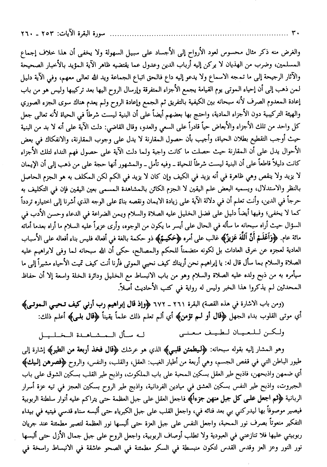 والغرض منه ذكر مثال محسوس لعود الأرواح إلى الأجساد على سبيل السهولة ولا يخفى أن هذا خلاف إجماع المسلمين، وضرب من الهذيان لا يركن إليه أرباب الدين وعدول عما يقتضيه ظاهر الآية المؤيد بالأخبار الصحيحة والآثار الرجيحة إلى ما تمجه الاسماع ولا يدعو إليه داع فالحق اتباع الجماعة ويد الله تعالى معهم، وفي الآية دليل لمن ذهب إلى أن إحياء الموتى يوم القيامة يجمع الأجزاء المتفرقة وإرسال الروح إليها بعد تركيبها وليس هو من باب إعادة المعدوم الصرف لأنه سبحانه بين الكيفية بالتفريق ثم الجمع وإعادة الروح ولم يعدم هناك سوى الجزء الصوري والهيئة التركيبية دون الأجزاء المادية، واحتج بها بعضهم أيضا على أن البنية ليست شرطا في الحياة لأنه تعالى جعل كل واحد من تلك الأجزاء والأبعاض حيا قادرا على السعي والعدو، وقال القاضي: دلت الآية على أنه لا بد من البنية حيث أوجب التقطيع بطلان الحياة، وأجيب بأن حصول المقارنة لا يدل على وجوب المقارنة، والانفكاك في بعض الأحوال يدل على أن المقارنة حيث حصلت ما كانت واجبة ولما دلت الآية على حصول فهم النداء لتلك الأجزاء كانت دليلا قاطعا على أن البنية ليست شرطا للحياة- وفيه تأمل- والمشهور أنها حجة على من ذهب إلى أن الإيمان لا يزيد ولا ينقص وهي ظاهرة في أنه يزيد في الكيف وإن كان لا يزيد في الكم لكن المكلف به هو الجزم الحاصل بالنظر والاستدلال، ويسميه البعض علم اليقين لا الجزم الكائن بالمشاهدة المسمى بعين اليقين فإن في التكليف به حرجا في الدين، وأنت تعلم أن في دلالة الآية على زيادة الايمان ونقصه بناء على الوجه الذي أشرنا إلى اختياره ترددا كما لا يخفى وفيها أيضا دليل على فضل الخليل عليه الصلاة والسلام ويمن الضراعة في الدعاء وحسن الأدب في السؤال حيث أراه سبحانه ما سأله في الحال على أيسر ما