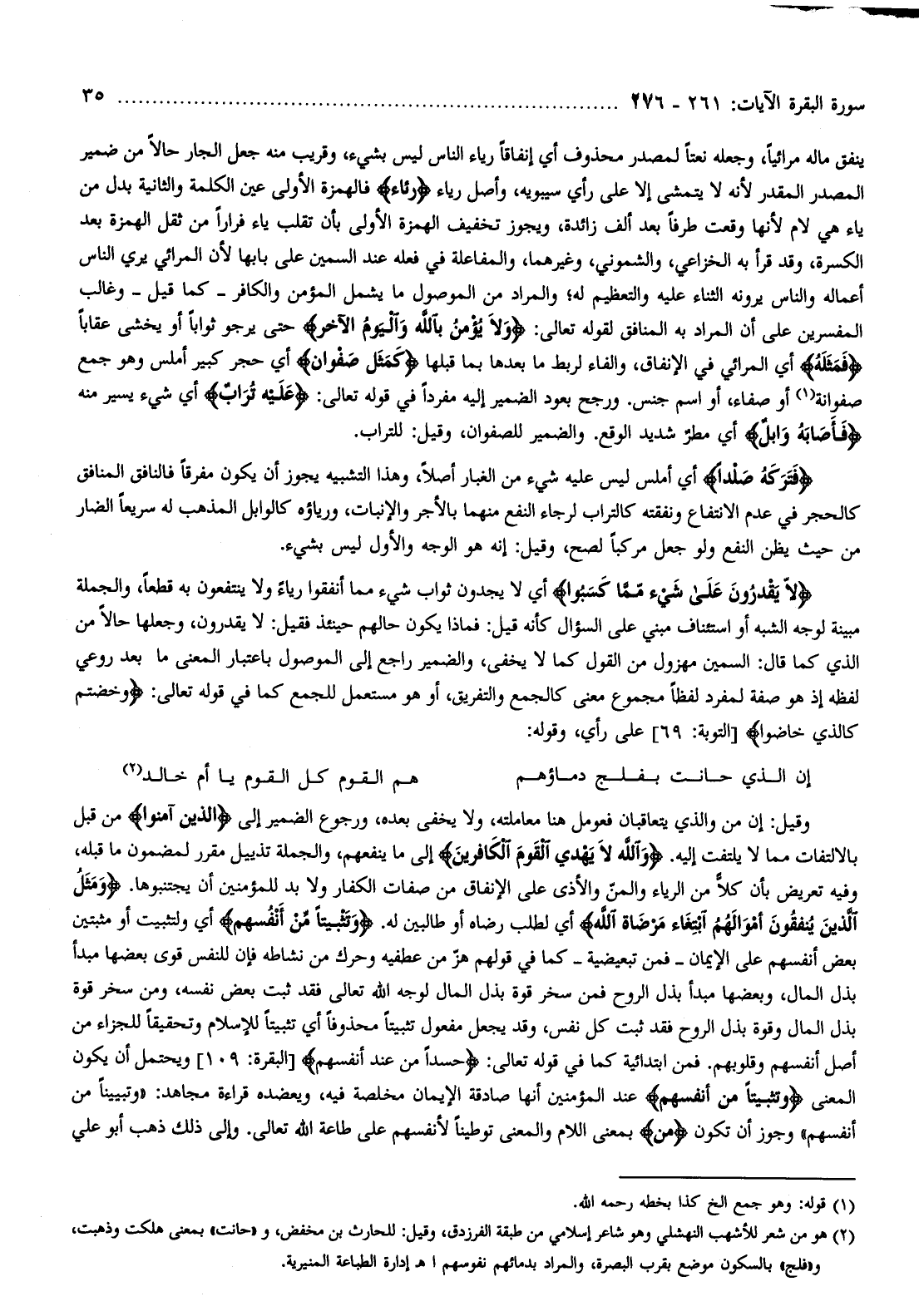 ينفق ماله مرائيا، وجعله نعتا لمصدر محذوف أي إنفاقا رياء الناس ليس بشيء، وقريب منه جعل الجار حالا من ضمير المصدر المقدر لأنه لا يتمشى إلا على رأي سيبويه، وأصل رياء رِئاءَ فالهمزة الأولى عين الكلمة والثانية بدل من ياء هي لام لأنها وقعت طرفا بعد ألف زائدة، ويجوز تخفيف الهمزة الأولى بأن تقلب ياء فرارا من ثقل الهمزة بعد الكسرة، وقد قرأ به الخزاعي، والشموني، وغيرهما، والمفاعلة في فعله عند السمين على بابها لأن المرائي يري الناس أعماله والناس يرونه الثناء عليه والتعظيم له والمراد من الموصول ما يشمل المؤمن والكافر- كما قيل- وغالب المفسرين على أن المراد به المنافق لقوله تعالى: وَلا يُؤْمِنُ بِاللَّهِ وَالْيَوْمِ الْآخِرِ حتى يرجو ثوابا أو يخشى عقابا فَمَثَلُهُ أي المرائي في الإنفاق، والفاء لربط ما بعدها بما قبلها كَمَثَلِ صَفْوانٍ أي حجر كبير أملس وهو جمع صفوانة (¬1) أو صفاء، أو اسم جنس. ورجح بعود الضمير إليه مفردا في قوله تعالى: عَلَيْهِ تُرابٌ أي شيء يسير منه فَأَصابَهُ وابِلٌ أي مطر شديد الوقع. والضمير للصفوان، وقيل: للتراب.