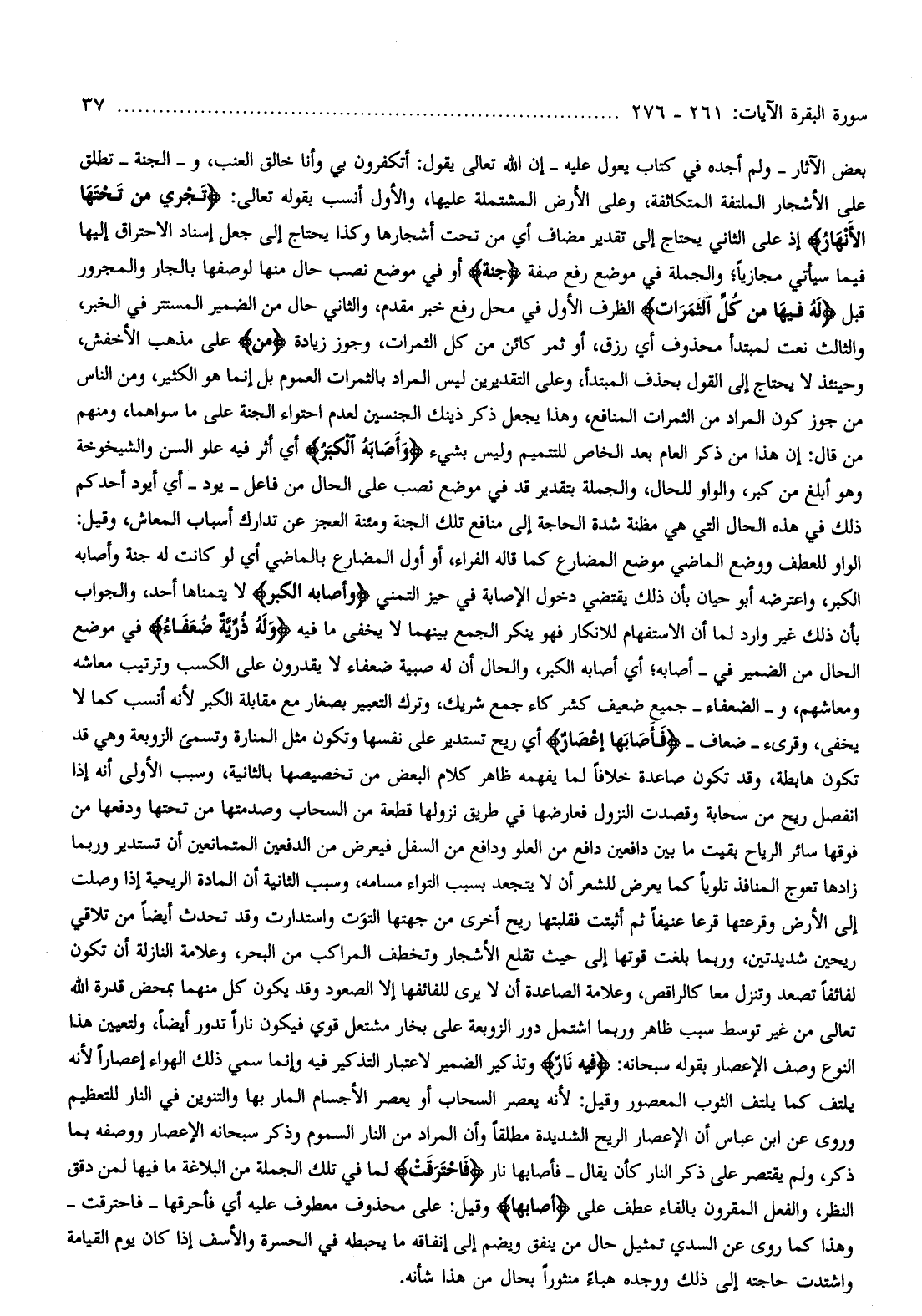 الواو للعطف ووضع الماضي موضع المضارع كما قاله الفراء، أو أول المضارع بالماضي أي لو كانت له جنة وأصابه الكبر، واعترضه أبو حيان بأن ذلك يقتضي دخول الإصابة في حيز التمني وَأَصابَهُ الْكِبَرُ لا يتمناها أحد، والجواب بأن ذلك غير وارد لما أن الاستفهام للانكار فهو ينكر الجمع بينهما لا يخفى ما فيه وَلَهُ ذُرِّيَّةٌ ضُعَفاءُ في موضع الحال من الضمير في- أصابه أي أصابه الكبر، والحال أن له صبية ضعفاء لا يقدرون على الكسب وترتيب معاشه ومعاشهم، والضعفاء- جميع ضعيف كشركاء جمع شريك، وترك التعبير بصغار مع مقابلة الكبر لأنه أنسب كما لا يخفى، وقرئ- ضعاف- فَأَصابَها إِعْصارٌ أي ريح تستدير على نفسها وتكون مثل المنارة وتسمى الزوبعة وهي قد تكون هابطة، وقد تكون صاعدة خلافا لما يفهمه ظاهر كلام البعض من تخصيصها بالثانية، وسبب الأولى أنه إذا انفصل ريح من سحابة وقصدت النزول فعارضها في طريق نزولها قطعة من السحاب وصدمتها من تحتها ودفعها من فوقها سائر الرياح بقيت ما بين دافعين دافع من العلو ودافع من السفل فيعرض من الدفعين المتمانعين أن تستدير وربما زادها تعوج المنافذ تلويا كما يعرض للشعر أن لا يتجعد بسبب التواء مسامه، وسبب الثانية أن المادة الريحية إذا وصلت إلى الأرض وقرعتها قرعا عنيفا ثم أثبتت فقلبتها ريح أخرى من جهتها التوت واستدارت وقد تحدث أيضا من تلاقي ريحين شديدتين، وربما بلغت قوتها إلى حيث تقلع الأشجار وتخطف المراكب من البحر، وعلامة النازلة أن تكون لفائفا تصعد وتنزل معا كالراقص، وعلامة الصاعدة أن لا يرى للفائفها إلا الصعود وقد يكون كل منهما بمحض قدرة الله تعالى من غير توسط سبب ظاهر وربما اشتمل دور الزوبعة على بخار مشتعل قوي فيكون نار تدور أيضا، ولتعيين هذا النوع وصف الإعصار بقوله سبحانه: فِيهِ نارٌ وتذكير الضمير لاعتبار التذكير فيه وإنما سمي ذلك الهواء إعصارا لأنه يلتف كما يلتف الثوب المعصور وقيل: لأنه يعصر السحاب أو يعصر الأجسام المار بها والتنوين في النار للتعظيم وروى عن ابن عباس أن الإعصار الريح الشديدة مطلقا وأن المراد من النار السموم وذكر سبحانه الإعصار ووصفه بما ذكر، ولم يقتصر على ذكر النار كأن يقال- فأصابها نار فَاحْتَرَقَتْ لما في تلك الجملة من البلاغة ما فيها لمن دقق النظر، والفعل المقرون بالفاء عطف على أَصابَها وقيل: على محذوف معطوف عليه أي فأحرقها- فاحترقت- وهذا كما روى عن السدي تمثيل حال من ينفق ويضم إلى إنفاقه ما يحبطه في الحسرة والأسف إذا كان يوم القيامة واشتدت حاجته إلى ذلك ووجده هباء منثورا بحال من هذا شأنه.