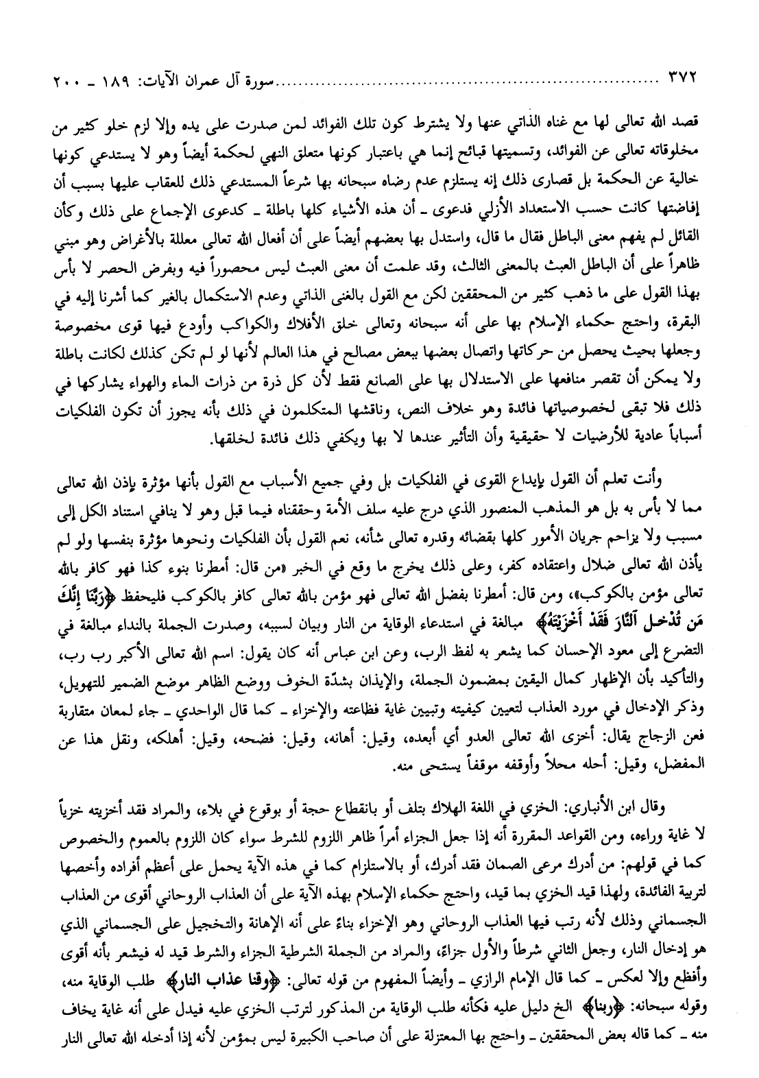 قصد الله تعالى لها مع غناه الذاتي عنها ولا يشترط كون تلك الفوائد لمن صدرت على يده وإلا لزم خلو كثير من مخلوقاته تعالى عن الفوائد، وتسميتها قبائح إنما هي باعتبار كونها متعلق النهي لحكمة أيضا وهو لا يستدعي كونها خالية عن الحكمة بل قصارى ذلك إنه يستلزم عدم رضاه سبحانه بها شرعا المستدعي ذلك للعقاب عليها بسبب أن إفاضتها كانت حسب الاستعداد الأزلي فدعوى- أن هذه الأشياء كلها باطلة- كدعوى الإجماع على ذلك وكأن القائل لم يفهم معنى الباطل فقال ما قال، واستدل بها بعضهم أيضا على أن أفعال الله تعالى معللة بالأغراض وهو مبني ظاهرا على أن الباطل العبث بالمعنى الثالث، وقد علمت أن معنى العبث ليس محصورا فيه وبفرض الحصر لا بأس بهذا القول على ما ذهب كثير من المحققين لكن مع القول بالغنى الذاتي وعدم الاستكمال بالغير كما أشرنا إليه في البقرة، واحتج حكماء الإسلام بها على أنه سبحانه وتعالى خلق الأفلاك والكواكب وأودع فيها قوى مخصوصة وجعلها بحيث يحصل من حركاتها واتصال بعضها ببعض مصالح في هذا العالم لأنها لو لم تكن كذلك لكانت باطلة ولا يمكن أن تقصر منافعها على الاستدلال بها على الصانع فقط لأن كل ذرة من ذرات الماء والهواء يشاركها في ذلك فلا تبقى لخصوصياتها فائدة وهو خلاف النص، وناقشها المتكلمون في ذلك بأنه يجوز أن تكون الفلكيات أسبابا عادية للأرضيات لا حقيقية وأن التأثير عندها لا بها ويكفي ذلك فائدة لخلقها.