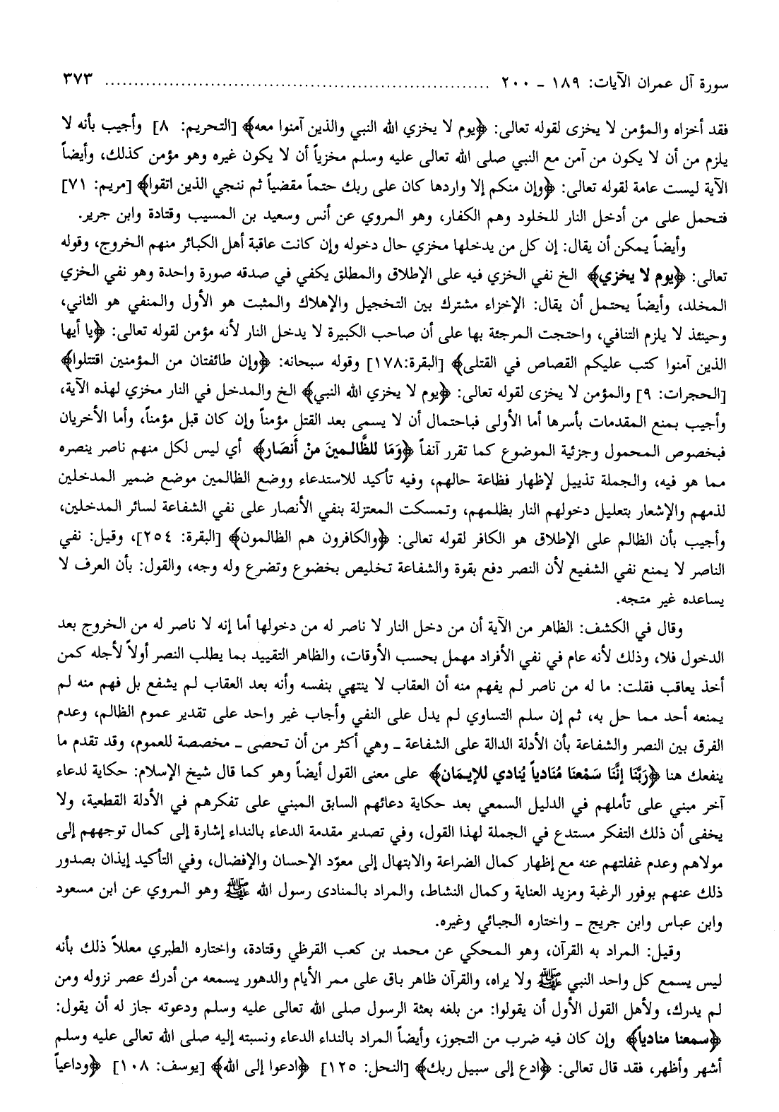 وأيضا يمكن أن يقال: إن كل من يدخلها مخزي حال دخوله وإن كانت عاقبة أهل الكبائر منهم الخروج، وقوله تعالى: يَوْمَ لا يُخْزِي إلخ نفي الخزي فيه على الإطلاق والمطلق يكفي في صدقه صورة واحدة وهو نفي الخزي المخلد، وأيضا يحتمل أن يقال: الإخزاء مشترك بين التخجيل والإهلاك والمثبت هو الأول والمنفي هو الثاني، وحينئذ لا يلزم التنافي، واحتجت المرجئة بها على أن صاحب الكبيرة لا يدخل النار لأنه مؤمن لقوله تعالى: يا أَيُّهَا الَّذِينَ آمَنُوا كُتِبَ عَلَيْكُمُ الْقِصاصُ فِي الْقَتْلى [البقرة: 178] وقوله سبحانه: وَإِنْ طائِفَتانِ مِنَ الْمُؤْمِنِينَ اقْتَتَلُوا [الحجرات: 9] والمؤمن لا يخزى لقوله تعالى: يَوْمَ لا يُخْزِي اللَّهُ النَّبِيَّ إلخ والمدخل في النار مخزي لهذه الآية، وأجيب بمنع المقدمات بأسرها أما الأولى فباحتمال أن لا يسمى بعد القتل مؤمنا وإن كان قبل مؤمنا، وأما الأخريان فبخصوص المحمول وجزئية الموضوع كما تقرر آنفا وَما لِلظَّالِمِينَ مِنْ أَنْصارٍ أي ليس لكل منهم ناصر ينصره مما هو فيه، والجملة تذييل لإظهار فظاعة حالهم، وفيه تأكيد للاستدعاء ووضع الظالمين موضع ضمير المدخلين لذمهم والإشعار بتعليل دخولهم النار بظلمهم، وتمسكت المعتزلة بنفي الأنصار على نفي الشفاعة لسائر المدخلين، وأجيب بأن الظالم على الإطلاق هو الكافر لقوله تعالى: وَالْكافِرُونَ هُمُ الظَّالِمُونَ [البقرة: 254] ، وقيل: نفي الناصر لا يمنع نفي الشفيع لأن النصر دفع بقوة والشفاعة تخليص بخضوع وتضرع وله وجه، والقول: بأن العرف لا يساعده غير متجه.