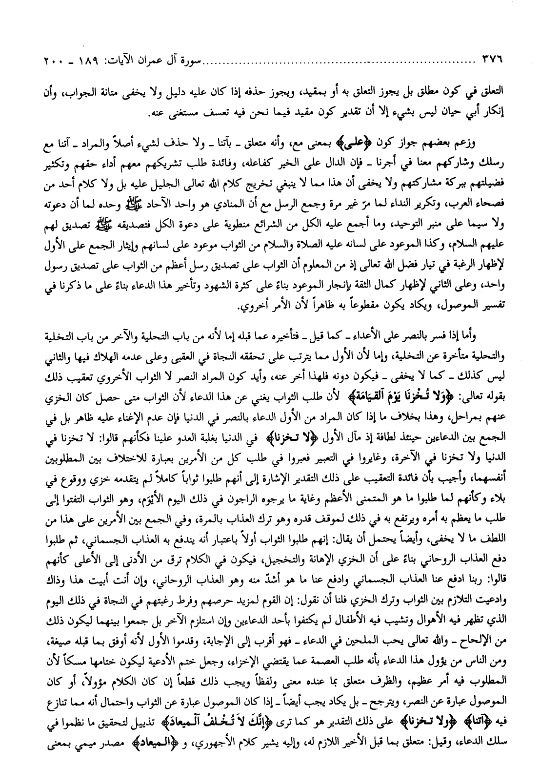 وأما إذا فسر بالنصر على الأعداء- كما قيل- فتأخيره عما قبله إما لأنه من باب التحلية والآخر من باب التخلية والتحلية متأخرة عن التخلية، وإما لأن الأول مما يترتب على تحققه النجاة في العقبى وعلى عدمه الهلاك فيها والثاني ليس كذلك- كما لا يخفى- فيكون دونه فلهذا أخر عنه، وأيد كون المراد النصر لا الثواب الأخروي تعقيب ذلك بقوله تعالى: وَلا تُخْزِنا يَوْمَ الْقِيامَةِ لأن طلب الثواب يغني عن هذا الدعاء لأن الثواب متى حصل كان الخزي عنهم بمراحل، وهذا بخلاف ما إذا كان المراد من الأول الدعاء بالنصر في الدنيا فإن عدم الإغناء عليه ظاهر بل في الجمع بين الدعاءين حينئذ لطافة إذ مآل الأول لا تُخْزِنا في الدنيا بغلبة العدو علينا فكأنهم قالوا: لا تخزنا في الدنيا ولا تخزنا في الآخرة، وغايروا في التعبير فعبروا في طلب كل من الأمرين بعبارة للاختلاف بين المطلوبين أنفسهما، وأجيب بأن فائدة التعقيب على ذلك التقدير الإشارة إلى أنهم طلبوا ثوابا كاملا لم يتقدمه خزي ووقوع في بلاء وكأنهم لما طلبوا ما هو المتمنى الأعظم وغاية ما يرجوه الراجون في ذلك اليوم الأيوم، وهو الثواب التفتوا إلى طلب ما يعظم به أمره ويرتفع به في ذلك لموقف قدره وهو ترك العذاب بالمرة، وفي الجمع بين الأمرين على هذا من اللطف ما لا يخفى، وأيضا يحتمل أن يقال: إنهم طلبوا الثواب أولا باعتبار أنه يندفع به العذاب الجسماني، ثم طلبوا دفع العذاب الروحاني بناء على أن الخزي الإهانة والتخجيل، فيكون في الكلام ترق من الأدنى إلى الأعلى كأنهم قالوا: ربنا ادفع عنا العذاب الجسماني وادفع عنا ما هو أشدّ منه وهو العذاب الروحاني، وإن أنت أبيت هذا وذاك وادعيت التلازم بين الثواب وترك الخزي فلنا أن نقول: إن القوم لمزيد حرصهم وفرط رغبتهم في النجاة في ذلك اليوم الذي تظهر فيه الأهوال وتشيب فيه الأطفال لم يكتفوا بأحد الدعاءين وإن استلزم الآخر بل جمعوا بينهما ليكون ذلك من الإلحاح- والله تعالى يحب الملحين في الدعاء- فهو أقرب إلى الإجابة، وقدموا الأول لأنه أوفق بما قبله صيغة، ومن الناس من يؤول هذا الدعاء بأنه طلب العصمة عما يقتضي الإخزاء، وجعل ختم الأدعية ليكون ختامها مسكا لأن المطلوب فيه أمر عظيم، والظرف متعلق بما عنده معنى ولفظا ويجب ذلك قطعا إن كان الكلام مؤولا، أو كان الموصول عبارة عن النصر، ويترجح- بل يكاد يجب أيضا- إذا كان الموصول عبارة عن الثواب واحتمال أنه مما تنازع فيه آتِنا وَلا تُخْزِنا على ذلك التقدير هو كما ترى إِنَّكَ لا تُخْلِفُ الْمِيعادَ تذييل لتحقيق ما نظموا في سلك الدعاء، وقيل: متعلق بما قبل الأخير اللازم له، وإليه يشير كلام الأجهوري، والْمِيعادَ مصدر ميمي بمعنى