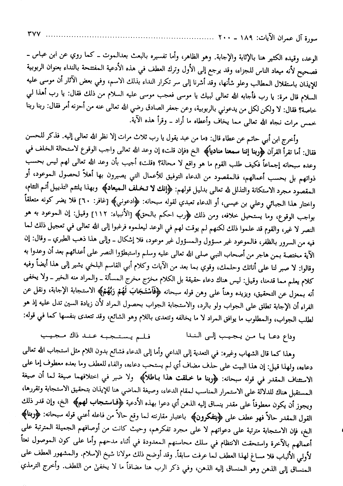 فذكر للحسن فقال: أما تقرأ القرآن رَبَّنا إِنَّنا سَمِعْنا مُنادِياً إلخ «فإن قلت» إن وعد الله تعالى واجب الوقوع لاستحالة الخلف في وعده سبحانه إجماعا فكيف طلب القوم ما هو واقع لا محالة؟ «قلت» أجيب بأن وعد الله تعالى لهم ليس بحسب ذواتهم بل بحسب أعمالهم، فالمقصود من الدعاء التوفيق للأعمال التي يصيرون بها أهلا لحصول الموعود، أو المقصود مجرد الاستكانة والتذلل لله تعالى بدليل قولهم: إِنَّكَ لا تُخْلِفُ الْمِيعادَ وبهذا يلتئم التذييل أتم التئام، واختار هذا الجبائي وعلي بن عيسى، أو الدعاء تعبدي لقوله سبحانه: ادْعُونِي [غافر: 60] فلا يضر كونه متعلقا بواجب الوقوع، وما يستحيل خلافه، ومن ذلك رَبِّ احْكُمْ بِالْحَقِّ [الأنبياء: 112] وقيل: إن الموعود به هو النصر لا غير، والقوم قد علموا ذلك لكنهم لم يوقت لهم في الوعد ليعلموه فرغبوا إلى الله تعالى في تعجيل ذلك لما فيه من السرور بالظفر، فالموعود غير مسؤول والمسئول غير موعود، فلا إشكال- وإلى هذا ذهب الطبري- وقال: إن الآية مختصة بمن هاجر من أصحاب النبي صلى الله تعالى عليه وسلم واستبطؤوا النصر على أعدائهم بعد أن وعدوا به وقالوا: لا صبر لنا على أناتك وحلمك، وقوي بما بعد من الآيات وكلام أبي القاسم البلخي يشير إلى هذا أيضا وفيه كلام يعلم مما قدمنا، وقيل: ليس هناك دعاء حقيقة بل الكلام مخرّج مخرج المسألة- والمراد منه الخبر- ولا يخفى أنه بمعزل عن التحقيق، ويزيده وهنا على وهن قوله سبحانه فَاسْتَجابَ لَهُمْ رَبُّهُمْ الاستجابة الإجابة، ونقل عن الفراء أن الإجابة تطلق على الجواب ولو بالرد، والاستجابة الجواب بحصول المراد لأن زيادة السين تدل عليه إذ هو لطلب الجواب، والمطلوب ما يوافق المراد لا ما يخالفه وتتعدى باللام وهو الشائع، وقد تتعدى بنفسها كما في قوله: