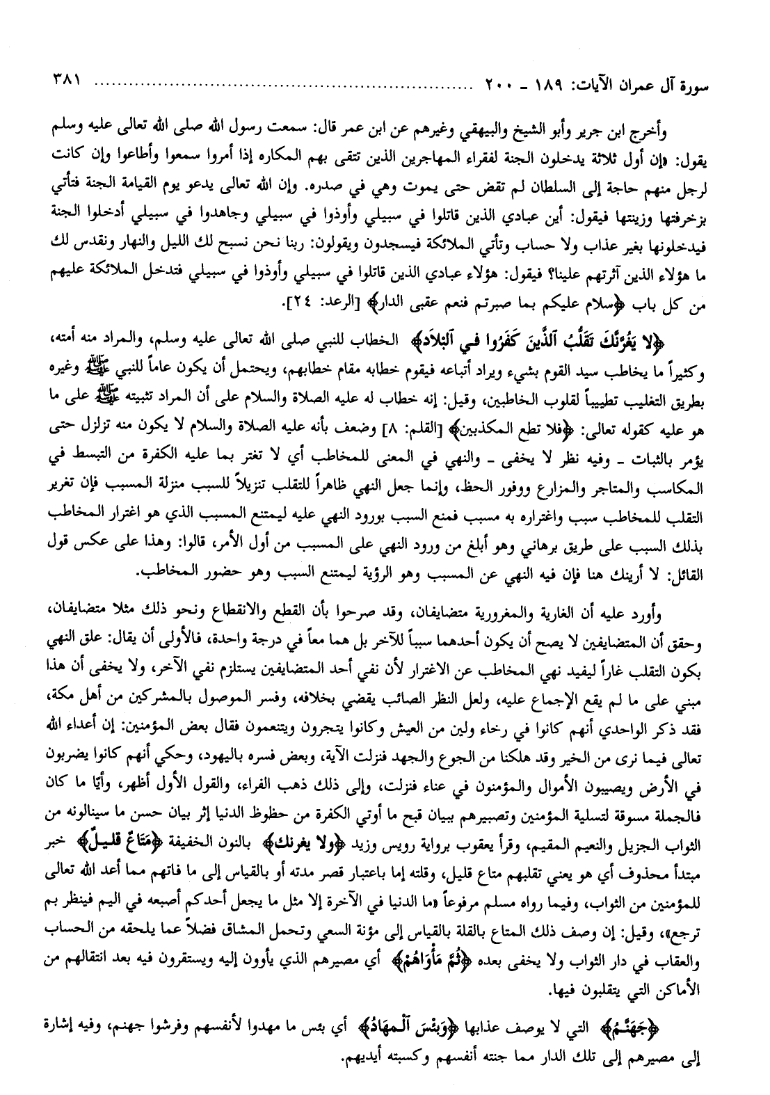 وأورد عليه أن الغارية والمغرورية متضايفان، وقد صرحوا بأن القطع والانقطاع ونحو ذلك مثلا متضايفان، وحقق أن المتضايفين لا يصح أن يكون أحدهما سببا للآخر بل هما معا في درجة واحدة، فالأولى أن يقال: علق النهي بكون التقلب غارا ليفيد نهي المخاطب عن الاغترار لأن نفي أحد المتضايفين يستلزم نفي الآخر، ولا يخفى أن هذا مبني على ما لم يقع الإجماع عليه، ولعل النظر الصائب يقضي بخلافه، وفسر الموصول بالمشركين من أهل مكة، فقد ذكر الواحدي أنهم كانوا في رخاء ولين من العيش وكانوا يتجرون ويتنعمون فقال بعض المؤمنين: إن أعداء الله تعالى فيما نرى من الخير وقد هلكنا من الجوع والجهد فنزلت الآية، وبعض فسره باليهود، وحكي أنهم كانوا يضربون في الأرض ويصيبون الأموال والمؤمنون في عناء فنزلت، وإلى ذلك ذهب الفراء، والقول الأول أظهر، وأيّا ما كان فالجملة مسوقة لتسلية المؤمنين وتصبيرهم ببيان قبح ما أوتي الكفرة من حظوظ الدنيا إثر بيان حسن ما سينالونه من الثواب الجزيل والنعيم المقيم، وقرأ يعقوب برواية رويس وزيد لا يَغُرَّنَّكَ بالنون الخفيفة مَتاعٌ قَلِيلٌ خبر مبتدأ محذوف أي هو يعني تقلبهم متاع قليل، وقلته إما باعتبار قصر مدته أو بالقياس إلى ما فاتهم مما أعد الله تعالى للمؤمنين من الثواب، وفيما رواه مسلم مرفوعا «ما الدنيا في الآخرة إلا مثل ما يجعل أحدكم أصبعه في اليم فينظر بم ترجع» ، وقيل: إن وصف ذلك المتاع بالقلة بالقياس إلى مؤنة السعي وتحمل المشاق فضلا عما يلحقه من الحساب والعقاب في دار الثواب ولا يخفى بعده ثُمَّ مَأْواهُمْ أي مصيرهم الذي يأوون إليه ويستقرون فيه بعد انتقالهم من الأماكن التي يتقلبون فيها.