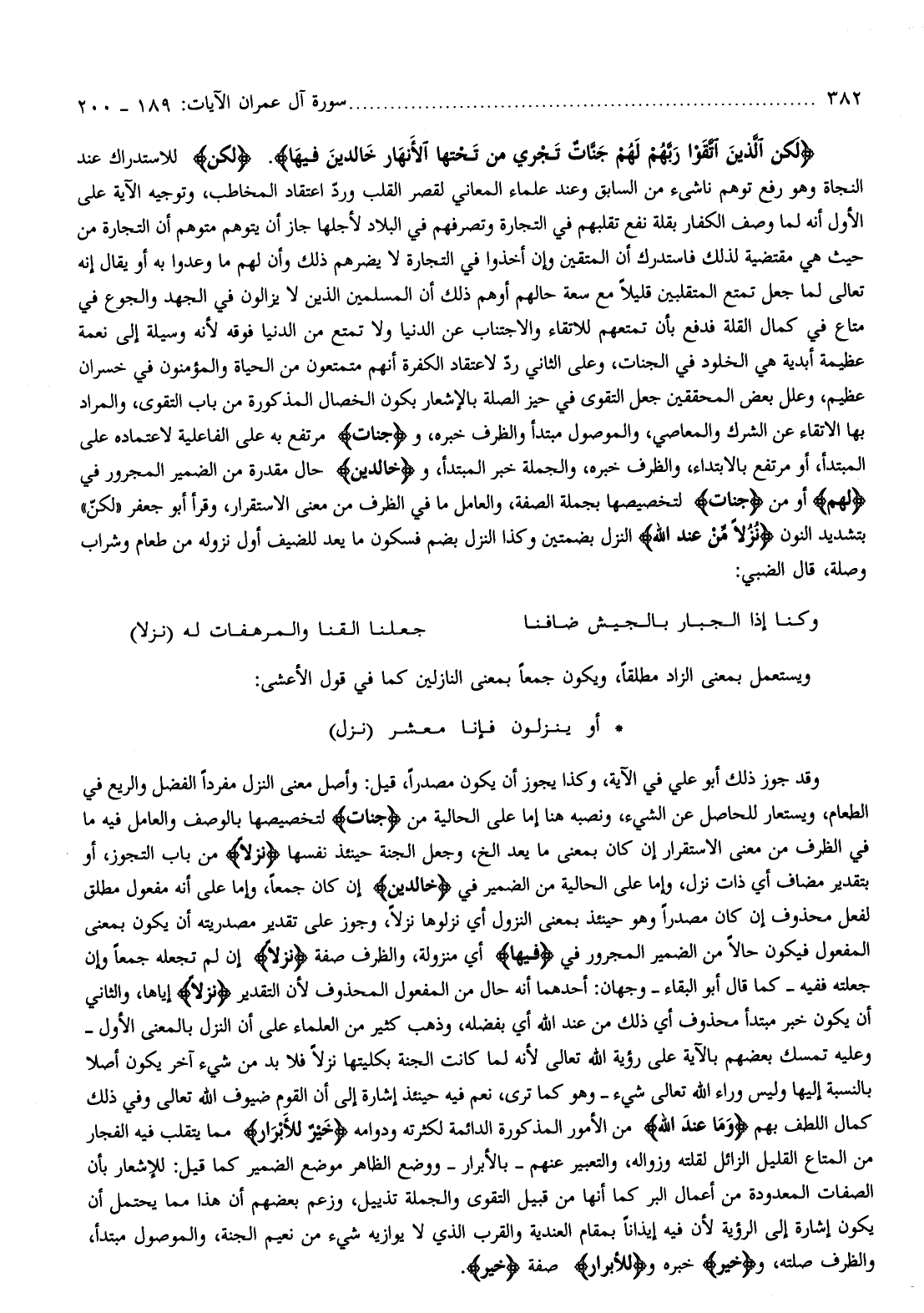 لكِنِ الَّذِينَ اتَّقَوْا رَبَّهُمْ لَهُمْ جَنَّاتٌ تَجْرِي مِنْ تَحْتِهَا الْأَنْهارُ خالِدِينَ فِيها. لكِنِ للاستدراك عند النجاة وهو رفع توهم ناشئ من السابق وعند علماء المعاني لقصر القلب وردّ اعتقاد المخاطب، وتوجيه الآية على الأول أنه لما وصف الكفار بقلة نفع تقلبهم في التجارة وتصرفهم في البلاد لأجلها جاز أن يتوهم متوهم أن التجارة من حيث هي مقتضية لذلك فاستدرك أن المتقين وإن أخذوا في التجارة لا يضرهم ذلك وأن لهم ما وعدوا به أو يقال إنه تعالى لما جعل تمتع المتقلبين قليلا مع سعة حالهم أو هم ذلك أن المسلمين الذين لا يزالون في الجهد والجوع في متاع في كمال القلة فدفع بأن تمتعهم للاتقاء والاجتناب عن الدنيا ولا تمتع من الدنيا فوقه لأنه وسيلة إلى نعمة عظيمة أبدية هي الخلود في الجنات، وعلى الثاني ردّ لاعتقاد الكفرة أنهم متمتعون من الحياة والمؤمنون في خسران عظيم، وعلل بعض المحققين جعل التقوى في حيز الصلة بالإشعار بكون الخصال المذكورة من باب التقوى، والمراد بها الاتقاء عن الشرك والمعاصي، والموصول مبتدأ والظرف خبره، وجَنَّاتٌ مرتفع به على الفاعلية لاعتماده على المبتدأ، أو مرتفع بالابتداء، والظرف خبره، والجملة خبر المبتدأ، وخالِدِينَ حال مقدرة من الضمير المجرور في لَهُمْ أو من جَنَّاتٌ لتخصيصها بجملة الصفة، والعامل ما في الظرف من معنى الاستقرار، وقرأ أبو جعفر «لكنّ» بتشديد النون نُزُلًا مِنْ عِنْدِ اللَّهِ النزل بضمتين وكذا النزل بضم فسكون ما يعد للضيف أول نزوله من طعام وشراب وصلة، قال الضبي: