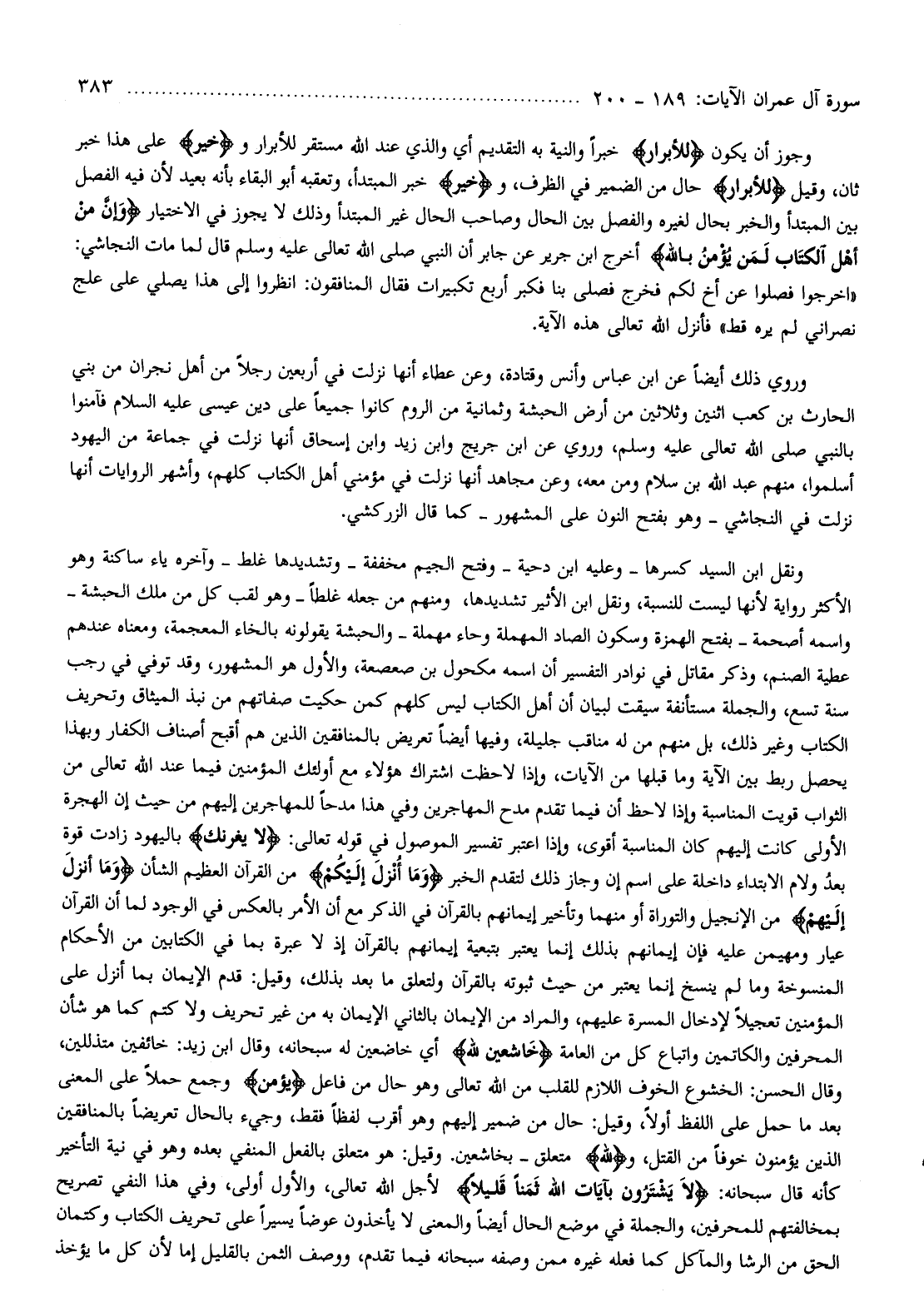 ونقل ابن السيد كسرها- وعليه ابن دحية- وفتح الجيم مخففة- وتشديدها غلط- وآخره ياء ساكنة وهو الأكثر رواية لأنها ليست للنسبة، ونقل ابن الأثير تشديدها، ومنهم من جعله غلطا- وهو لقب كل من ملك الحبشة- واسمه أصحمة- بفتح الهمزة وسكون الصاد المهملة وحاء مهملة- والحبشة يقولونه بالخاء المعجمة، ومعناه عندهم عطية الصنم، وذكر مقاتل في نوادر التفسير أن اسمه مكحول بن صعصعة، والأول هو المشهور، وقد توفي في رجب سنة تسع، والجملة مستأنفة سيقت لبيان أن أهل الكتاب ليس كلهم كمن حكيت صفاتهم من نبذ الميثاق وتحريف الكتاب وغير ذلك، بل منهم من له مناقب جليلة، وفيها أيضا تعريض بالمنافقين الذين هم أقبح أصناف الكفار وبهذا يحصل ربط بين الآية وما قبلها من الآيات، وإذا لاحظت اشتراك هؤلاء مع أولئك المؤمنين فيما عند الله تعالى من الثواب قويت المناسبة وإذا لاحظ أن فيما تقدم مدح المهاجرين وفي هذا مدحا للمهاجرين إليهم من حيث إن الهجرة الأولى كانت إليهم كان المناسبة أقوى، وإذا اعتبر تفسير الموصول في قوله تعالى: لا يَغُرَّنَّكَ باليهود زادت قوة بعد ولام الابتداء داخلة على اسم إن وجاز ذلك لتقدم الخبر وَما أُنْزِلَ إِلَيْكُمْ من القرآن العظيم الشأن وَما أُنْزِلَ إِلَيْهِمْ من الإنجيل والتوراة أو منهما وتأخير إيمانهم بالقرآن في الذكر مع أن الأمر بالعكس في الوجود لما أن القرآن عيار ومهيمن عليه فإن إيمانهم بذلك إنما يعتبر بتبعية إيمانهم بالقرآن إذ لا عبرة بما في الكتابين من الأحكام المنسوخة وما لم ينسخ إنما يعتبر من حيث ثبوته بالقرآن ولتعلق ما بعد بذلك، وقيل: قدم الإيمان بما أنزل على المؤمنين تعجيلا لإدخال المسرة عليهم، والمراد من الإيمان بالثاني الإيمان به من غير تحريف ولا كتم كما هو شأن المحرفين والكاتمين واتباع كل من العامة خاشِعِينَ لِلَّهِ أي خاضعين له سبحانه، وقال ابن زيد: خائفين متذللين، وقال الحسن: الخشوع الخوف اللازم للقلب من الله تعالى وهو حال من فاعل يُؤْمِنُ وجمع حملا على المعنى بعد ما حمل على اللفظ أولا، وقيل: حال من ضمير إليهم وهو أقرب لفظا فقط، وجيء بالحال تعريضا بالمنافقين الذين يؤمنون خوفا من القتل، ولِلَّهِ متعلق- بخاشعين. وقيل: هو متعلق بالفعل المنفي بعده وهو في نية التأخير كأنه قال سبحانه: لا يَشْتَرُونَ بِآياتِ اللَّهِ ثَمَناً قَلِيلًا لأجل الله تعالى، والأول أولى، وفي هذا النفي تصريح بمخالفتهم للمحرفين، والجملة في موضع الحال أيضا والمعنى لا يأخذون عوضا يسيرا على تحريف الكتاب وكتمان الحق من الرشا والمآكل كما فعله غيره ممن وصفه سبحانه فيما تقدم، ووصف الثمن بالقليل إما لأن كل ما يؤخذ