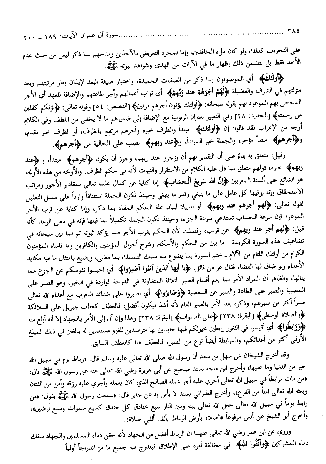 وقيل: متعلق به بناء على أن التقدير لهم أن يؤجروا عند ربهم، وجوز أن يكون أَجْرُهُمْ مبتدأ، وعِنْدَ رَبِّهِمْ خبره، «ولهم متعلق بما دل عليه الكلام من الاستقرار والثبوت لأنه في حكم الظرف، والأوجه من هذه الأوجه هو الشائع على ألسنة المعربين إِنَّ اللَّهَ سَرِيعُ الْحِسابِ إما كناية عن كمال علمه تعالى بمقادير الأجور ومراتب الاستحقاق وإنه يوفيها كل عامل على ما ينبغي وقدر ما ينبغي وحينئذ تكون الجملة استئنافا واردا على سبيل التعليل لقوله تعالى: لَهُمْ أَجْرُهُمْ عِنْدَ رَبِّهِمْ أو تذييلا لبيان علة الحكم المفاد بما ذكر، وإما كناية عن قرب الأجر الموعود فإن سرعة الحساب تستدعي سرعة الجزاء، وحينئذ تكون الجملة تكميلا لما قبلها فإنه في معنى الوعد كأنه قيل: لَهُمْ أَجْرُهُمْ عِنْدَ رَبِّهِمْ عن قريب، وفصلت لأن الحكم بقرب الأجر مما يؤكد ثبوته ثم لما بين سبحانه في تضاعيف هذه السورة الكريمة- ما بين من الحكم والأحكام وشرح أحوال المؤمنين والكافرين وما قاساه المؤمنون الكرام من أولئك اللئام من الآلام- ختم السورة بما يضوع منه مسك التمسك بما مضى، ويضيع بامتثال ما فيه مكايد الأعداء ولو ضاق لها الفضا، فقال عز من قائل: يا أَيُّهَا الَّذِينَ آمَنُوا اصْبِرُوا أي احبسوا نفوسكم عن الجزع مما ينالها، والظاهر أن المراد الأمر بما يعم أقسام الصبر الثلاثة المتفاوتة في الدرجة الواردة في الخبر، وهو الصبر على المصيبة والصبر على الطاعة والصبر عن المعصية وَصابِرُوا أي اصبروا على شدائد الحرب مع أعداء الله تعالى صبرا أكثر من صبرهم، وذكره بعد الأمر بالصبر العام لأنه أشدّ فيكون أفضل، فالعطف كعطف جبريل على الملائكة وَالصَّلاةِ الْوُسْطى [البقرة: 238] عَلَى الصَّلَواتِ [البقرة: 238] وهذا وإن آل إلى الأمر بالجهاد إلا أنه أبلغ منه وَرابِطُوا أي أقيموا في الثغور رابطين خيولكم فيها حابسين لها مترصدين للغزو مستعدين له بالغين في ذلك المبلغ الأوفى أكثر من أعدائكم، والمرابطة أيضا نوع من الصبر، فالعطف هنا كالعطف السابق.