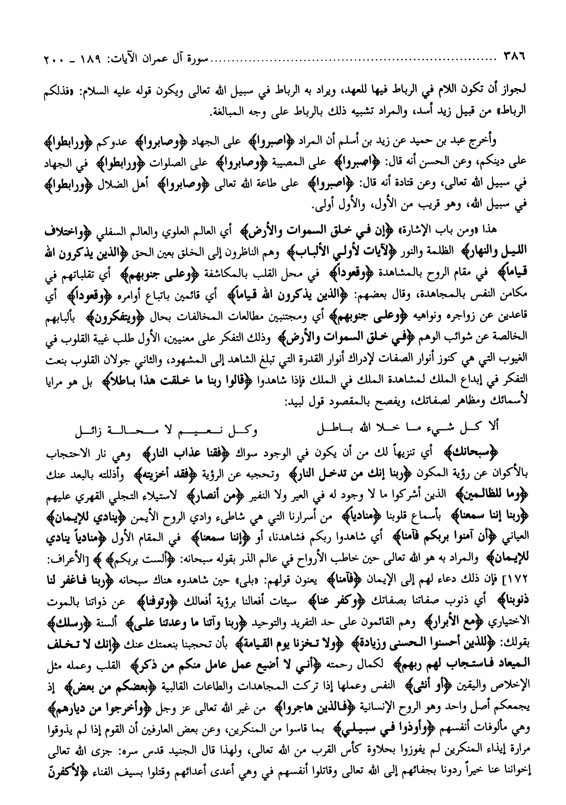 هذا «ومن باب الإشارة» إِنَّ فِي خَلْقِ السَّماواتِ وَالْأَرْضِ أي العالم العلوي والعالم السفلي وَاخْتِلافِ اللَّيْلِ وَالنَّهارِ الظلمة والنور لَآياتٍ لِأُولِي الْأَلْبابِ وهم الناظرون إلى الخلق بعين الحق الَّذِينَ يَذْكُرُونَ اللَّهَ قِياماً في مقام الروح بالمشاهدة وَقُعُوداً في محل القلب بالمكاشفة وَعَلى جُنُوبِهِمْ أي تقلباتهم في مكامن النفس بالمجاهدة، وقال بعضهم: الَّذِينَ يَذْكُرُونَ اللَّهَ قِياماً أي قائمين باتباع أوامره وَقُعُوداً أي قاعدين عن زواجره ونواهيه وَعَلى جُنُوبِهِمْ أي ومجتنبين مطالعات المخالفات بحال وَيَتَفَكَّرُونَ بألبابهم الخالصة عن شوائب الوهم فِي خَلْقِ السَّماواتِ وَالْأَرْضِ وذلك التفكر على معنيين، الأول طلب غيبة القلوب في الغيوب التي هي كنوز أنوار الصفات لإدراك أنوار القدرة التي تبلغ الشاهد إلى المشهود، والثاني جولان القلوب بنعت التفكر في إبداع الملك لمشاهدة الملك في الملك فإذا شاهدوا قالوا رَبَّنا ما خَلَقْتَ هذا باطِلًا بل هو مرايا لأسمائك ومظاهر لصفاتك، ويفصح بالمقصود قول لبيد: