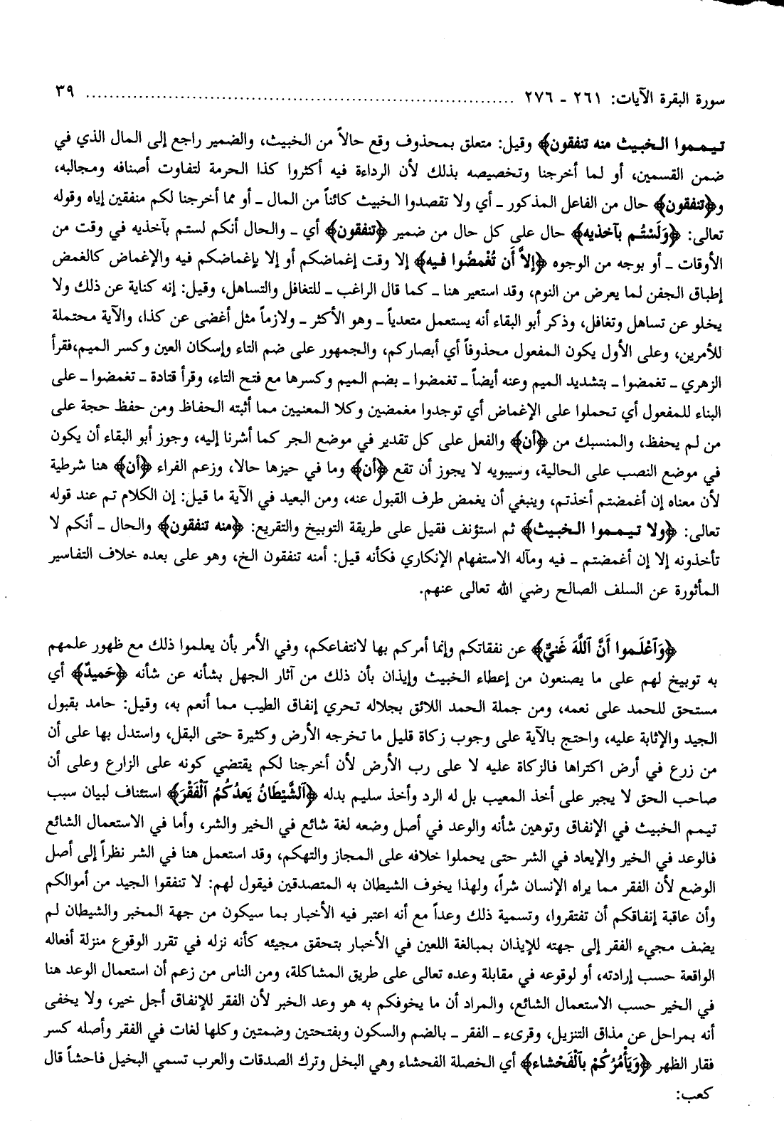 وقيل: متعلق بمحذوف وقع حالا من الخبيث، والضمير راجع إلى المال الذي في ضمن القسمين، أو لما أخرجنا وتخصيصه بذلك لأن الرداءة فيه أكثروا كذا الحرمة لتفاوت أصنافه ومجالبه، وتُنْفِقُونَ حال من الفاعل المذكور- أي ولا تقصدوا الخبيث كائنا من المال- أو مما أخرجنا لكم منفقين إياه وقوله تعالى: وَلَسْتُمْ بِآخِذِيهِ حال على كل حال من ضمير تُنْفِقُونَ أي- والحال أنكم لستم بآخذيه في وقت من الأوقات- أو بوجه من الوجوه إِلَّا أَنْ تُغْمِضُوا فِيهِ إلا وقت إغماضكم أو إلا بإغماضكم فيه والإغماض كالغمض إطباق الجفن لما يعرض من النوم، وقد استعير هنا- كما قال الراغب- للتغافل والتساهل، وقيل: إنه كناية عن ذلك ولا يخلو عن تساهل وتغافل، وذكر أبو البقاء أنه يستعمل متعديا- وهو الأكثر- ولازما مثل أغضى عن كذا، والآية محتملة للأمرين، وعلى الأول يكون المفعول محذوفا أي أبصاركم، والجمهور على ضم التاء وإسكان العين وكسر الميم، فقرأ الزهري- تغمضوا- بتشديد الميم وعنه أيضا- تغمضوا- بضم الميم وكسرها مع فتح التاء، وقرأ قتادة- تغمضوا- على البناء للمفعول أي تحملوا على الإغماض أي توجدوا مغمضين وكلا المعنيين مما أثبته الحفاظ ومن حفظ حجة على من لم يحفظ، والمنسبك من أَنْ والفعل على كل تقدير في موضع الجر كما أشرنا إليه، وجوز أبو البقاء أن يكون في موضع النصب على الحالية، وسيبويه لا يجوز أن تقع أَنْ وما في حيزها حالا، وزعم الفراء أَنْ هنا شرطية لأن معناه إن أغمضتم أخذتم، وينبغي أن يغمض طرف القبول عنه، ومن البعيد في الآية ما قيل: إن الكلام تم عند قوله تعالى: وَلا تَيَمَّمُوا الْخَبِيثَ ثم استؤنف فقيل على طريقة التوبيخ والتقريع: مِنْهُ تُنْفِقُونَ والحال- أنكم لا تأخذونه إلا إن أغمضتم- فيه ومآله الاستفهام الإنكاري فكأنه قيل: أمنه تنفقون إلخ، وهو على بعده خلاف التفاسير المأثورة عن السلف الصالح رضي الله تعالى عنهم.