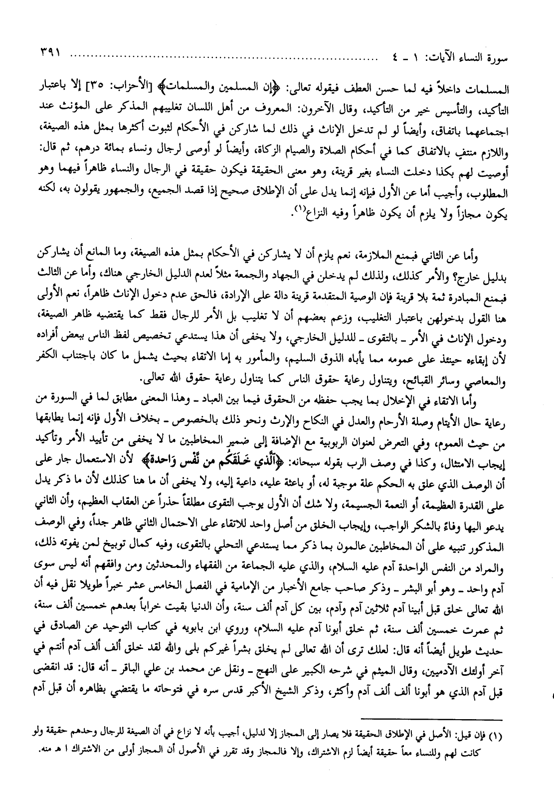 وأما عن الثاني فبمنع الملازمة، نعم يلزم أن لا يشاركن في الأحكام بمثل هذه الصيغة، وما المانع أن يشاركن بدليل خارج؟ والأمر كذلك، ولذلك لم يدخلن في الجهاد والجمعة مثلا لعدم الدليل الخارجي هناك، وأما عن الثالث فبمنع المبادرة ثمة بلا قرينة فإن الوصية المتقدمة قرينة دالة على الإرادة، فالحق عدم دخول الإناث ظاهرا، نعم الأولى هنا القول بدخولهن باعتبار التغليب، وزعم بعضهم أن لا تغليب بل الأمر للرجال فقط كما يقتضيه ظاهر الصيغة، ودخول الإناث في الأمر- بالتقوى- للدليل الخارجي، ولا يخفى أن هذا يستدعي تخصيص لفظ الناس ببعض أفراده لأن إبقاءه حينئذ على عمومه مما يأباه الذوق السليم، والمأمور به إما الاتقاء بحيث يشمل ما كان باجتناب الكفر والمعاصي وسائر القبائح، ويتناول رعاية حقوق الناس كما يتناول رعاية حقوق الله تعالى.