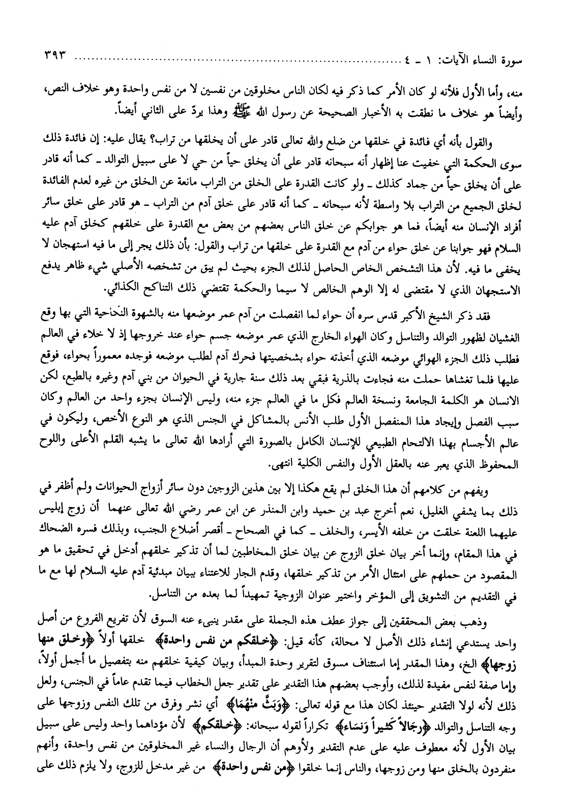 وذهب بعض المحققين إلى جواز عطف هذه الجملة على مقدر ينبئ عنه السوق لأن تفريع الفروع من أصل واحد يستدعي إنشاء ذلك الأصل لا محالة، كأنه قيل: خَلَقَكُمْ مِنْ نَفْسٍ واحِدَةٍ خلقها أولا وَخَلَقَ مِنْها زَوْجَها إلخ، وهذا المقدر إما استئناف مسوق لتقرير وحدة المبدأ، وبيان كيفية خلقهم منه بتفصيل ما أجمل أولا، وإما صفة لنفس مفيدة لذلك، وأوجب بعضهم هذا التقدير على تقدير جعل الخطاب فيما تقدم عاما في الجنس، ولعل ذلك لأنه لولا التقدير حينئذ لكان هذا مع قوله تعالى: وَبَثَّ مِنْهُما أي نشر وفرق من تلك النفس وزوجها على وجه التناسل والتوالد رِجالًا كَثِيراً وَنِساءً تكرارا لقوله سبحانه: خَلَقَكُمْ لأن مؤادهما واحد وليس على سبيل بيان الأول لأنه معطوف عليه على عدم التقدير ولأوهم أن الرجال والنساء غير المخلوقين من نفس واحدة، وأنهم منفردون بالخلق منها ومن زوجها، والناس إنما خلقوا مِنْ نَفْسٍ واحِدَةٍ من غير مدخل للزوج، ولا يلزم ذلك على