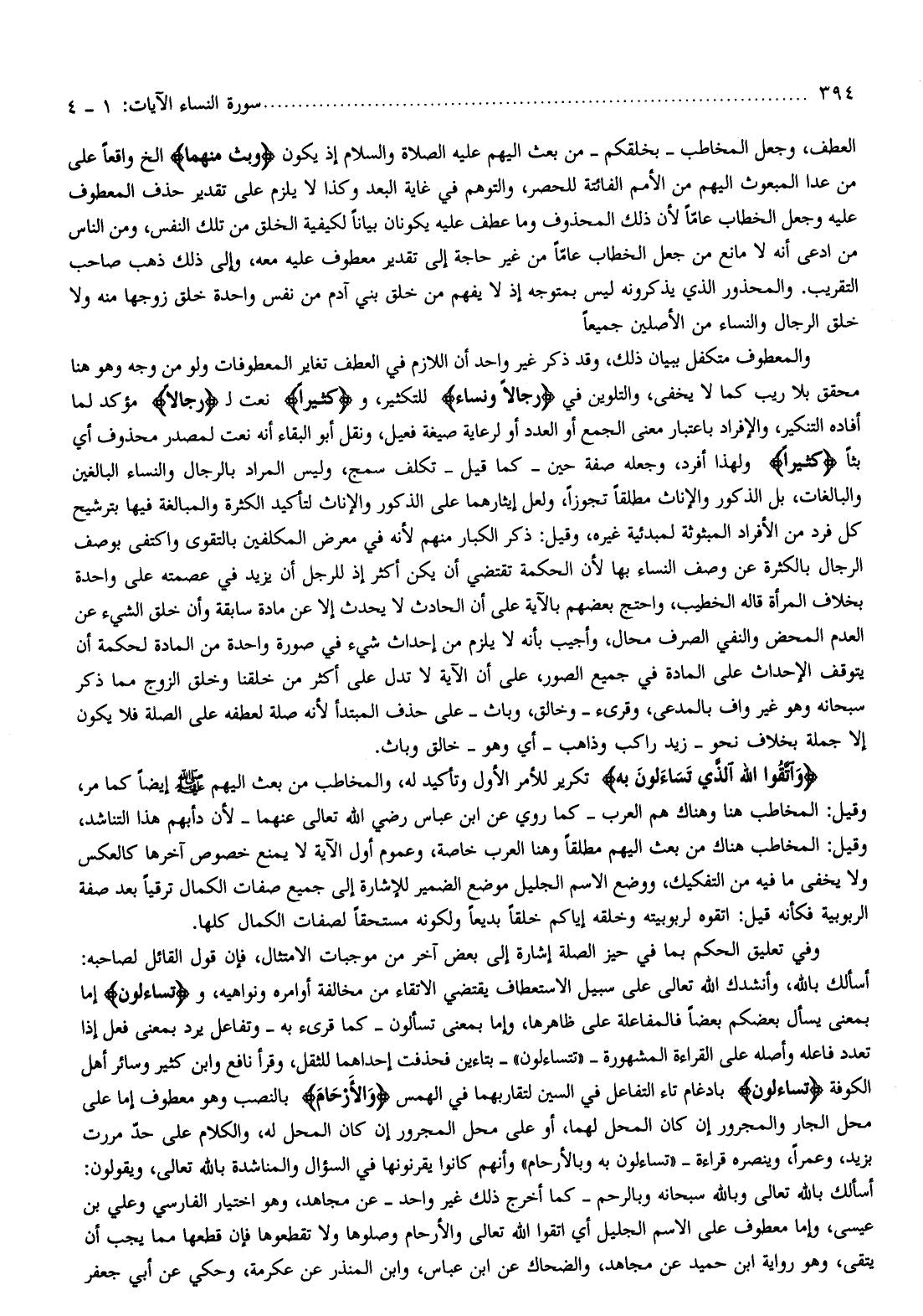 أسألك بالله، وأنشدك الله تعالى على سبيل الاستعطاف يقتضي الاتقاء من مخالفة أوامره ونواهيه، وتَسائَلُونَ إما بمعنى يسأل بعضكم بعضا فالمفاعلة على ظاهرها، وإما بمعنى تسألون- كما قرئ به- وتفاعل يرد بمعنى فعل إذا تعدد فاعله وأصله على القراءة المشهورة- «تتساءلون» - بتاءين فحذفت إحداهما للثقل، وقرأ نافع وابن كثير وسائر أهل الكوفة تَسائَلُونَ بإدغام تاء التفاعل في السين لتقاربهما في الهمس وَالْأَرْحامَ بالنصب وهو معطوف إما على محل الجار والمجرور إن كان المحل لهما، أو على محل المجرور إن كان المحل له، والكلام على حدّ مررت بزيد، وعمرا، وينصره قراءة- «تساءلون به وبالأرحام» وأنهم كانوا يقرنونها في السؤال والمناشدة بالله تعالى، ويقولون: