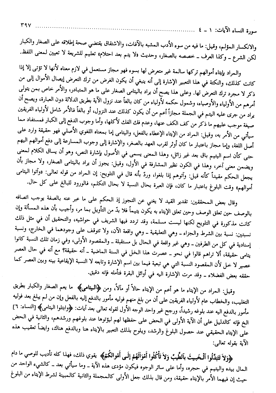 وَلا تَتَبَدَّلُوا الْخَبِيثَ بِالطَّيِّبِ وَلا تَأْكُلُوا أَمْوالَهُمْ إِلى أَمْوالِكُمْ يقوي ذلك، فهذا كله تأديب للوصي ما دام المال بيده واليتيم في حجره، وأما على سائر الوجوه فيكون مؤدى هذه الآية- وما سيأتي بعد- كالشيء الواحد من حيث إن فيهما الأمر بالإيتاء حقيقة، ومن قال بذلك جعل الأولى كالمجملة والثانية كالمبينة لشرط الإيتاء من البلوغ