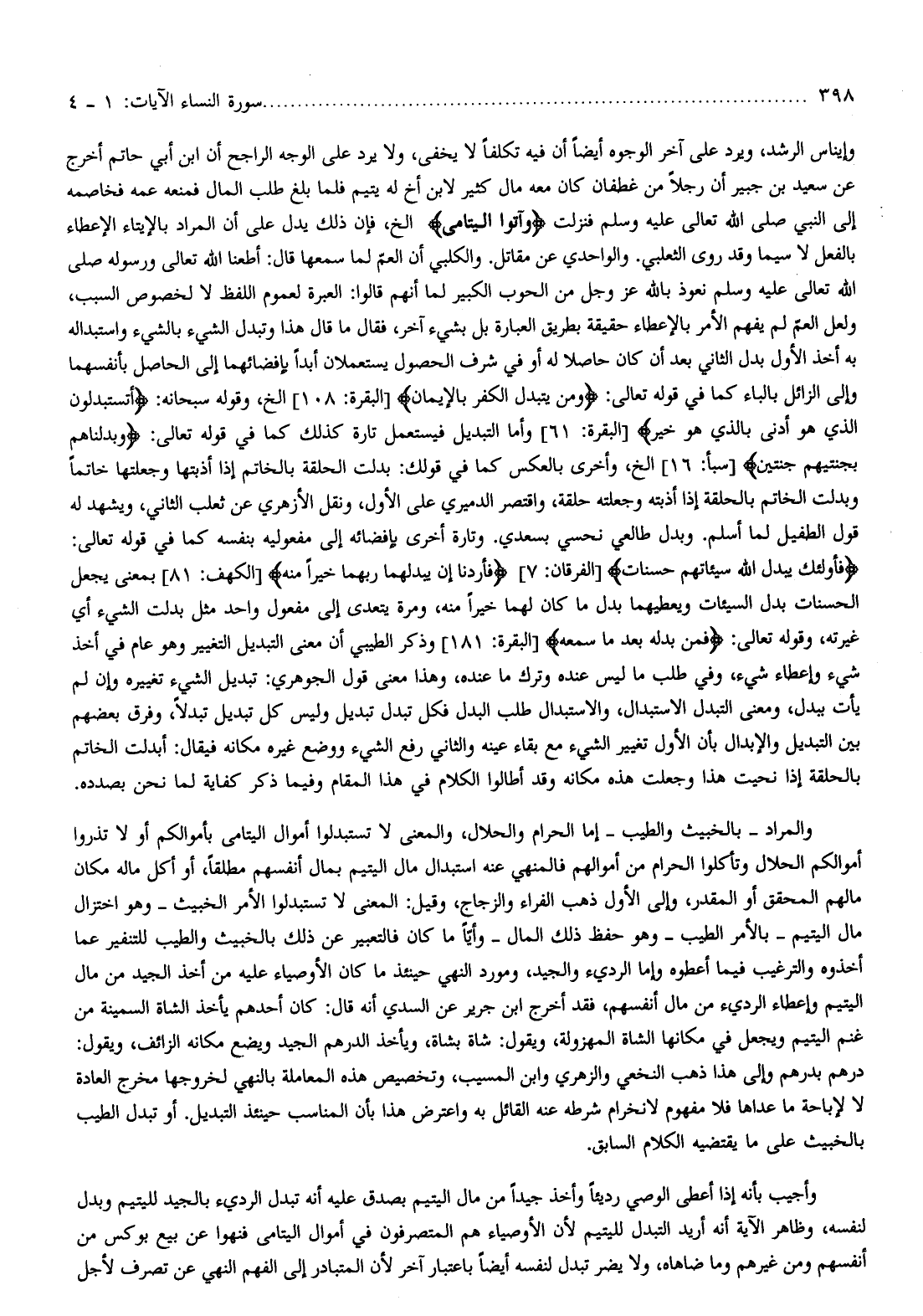 وأجيب بأنه إذا أعطى الوصي رديئا وأخذ جيدا من مال اليتيم بصدق عليه أنه تبدل الرديء بالجيد لليتيم وبدل لنفسه، وظاهر الآية أنه أريد التبدل لليتيم لأن الأوصياء هم المتصرفون في أموال اليتامى فنهوا عن بيع بوكس من أنفسهم ومن غيرهم وما ضاهاه، ولا يضر تبدل لنفسه أيضا باعتبار آخر لأن المتبادر إلى الفهم النهي عن تصرف لأجل