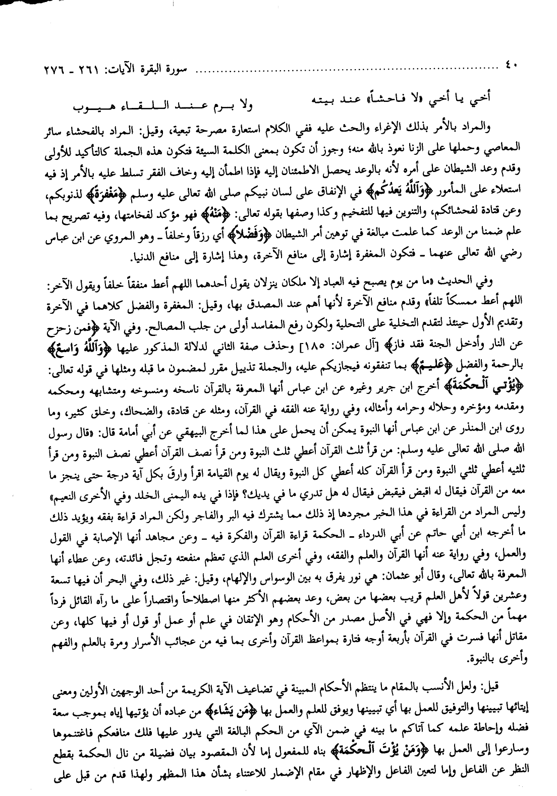 وقدم منافع الآخرة لأنها أهم عند المصدق بها، وقيل: المغفرة والفضل كلاهما في الآخرة وتقديم الأول حينئذ لتقدم التخلية على التحلية ولكون رفع المفاسد أولى من جلب المصالح. وفي الآية فَمَنْ زُحْزِحَ عَنِ النَّارِ وَأُدْخِلَ الْجَنَّةَ فَقَدْ فازَ [آل عمران: 185] وحذف صفة الثاني لدلالة المذكور عليها وَاللَّهُ واسِعٌ بالرحمة والفضل عَلِيمٌ بما تنفقونه فيجازيكم عليه، والجملة تذييل مقرر لمضمون ما قبله ومثلها في قوله تعالى:
