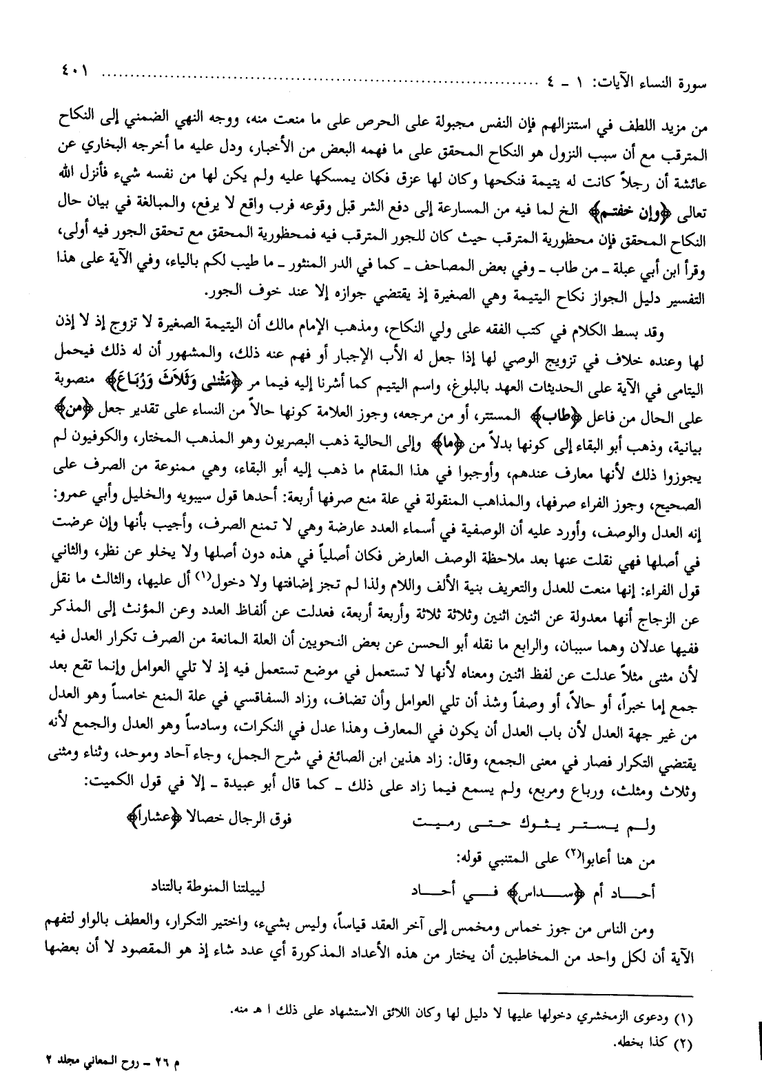 وقد بسط الكلام في كتب الفقه على ولي النكاح، ومذهب الإمام مالك أن اليتيمة الصغيرة لا تزوج إذ لا إذن لها وعنده خلاف في تزويج الوصي لها إذا جعل له الأب الإجبار أو فهم عنه ذلك، والمشهور أن له ذلك فيحمل اليتامى في الآية على الحديثات العهد بالبلوغ، واسم اليتيم كما أشرنا إليه فيما مر مَثْنى وَثُلاثَ وَرُباعَ منصوبة على الحال من فاعل طابَ المستتر، أو من مرجعه، وجوز العلامة كونها حالا من النساء على تقدير جعل مِنَ بيانية، وذهب أبو البقاء إلى كونها بدلا من ما وإلى الحالية ذهب البصريون وهو المذهب المختار، والكوفيون لم يجوزوا ذلك لأنها معارف عندهم، وأوجبوا في هذا المقام ما ذهب إليه أبو البقاء، وهي ممنوعة من الصرف على الصحيح، وجوز الفراء صرفها، والمذاهب المنقولة في علة منع صرفها أربعة: أحدها قول سيبويه والخليل وأبي عمرو: