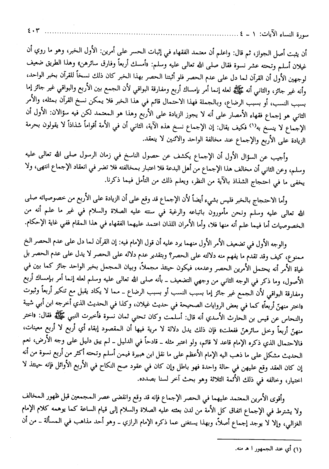 وهذا الطريق ضعيف لوجهين الأول أن القرآن لما دل على عدم الحصر فلو أثبتنا الحصر بهذا الخبر كان ذلك نسخا للقرآن بخبر الواحد، وأنه غير جائز، والثاني أنه صلّى الله عليه وسلم لعله إنما أمر بإمساك أربع ومفارقة البواقي لأن الجمع بين الأربع والبواقي غير جائز إما بسبب النسب، أو بسبب الرضاع، وبالجملة فهذا الاحتمال قائم في هذا الخبر فلا يمكن نسخ القرآن بمثله، والأمر الثاني هو إجماع فقهاء الأمصار على أنه لا يجوز الزيادة على الأربع وهذا هو المعتمد لكن فيه سؤالان: الأول أن الإجماع لا ينسخ به (¬1) فكيف يقال: إن الإجماع نسخ هذه الآية، الثاني أن في الأمة أقواما شذاذا لا يقولون بحرمة الزيادة على الأربع والإجماع عند مخالفة الواحد والاثنين لا ينعقد.