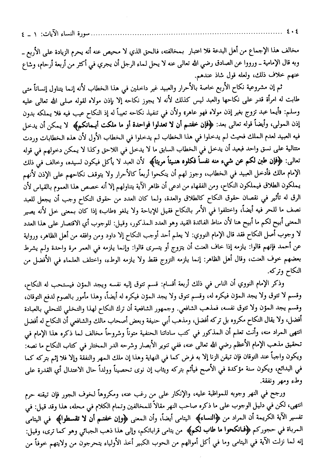 مخالف هذا الإجماع من أهل البدعة فلا اعتبار بمخالفته، فالحق الذي لا محيص عنه أنه يحرم الزيادة على الأربع- وبه قال الإمامية- ورووا عن الصادق رضي الله تعالى عنه لا يحل لماء الرجل أن يجري في أكثر من أربعة أرحام، وشاع عنهم خلاف ذلك، ولعله قول شاذ عندهم.