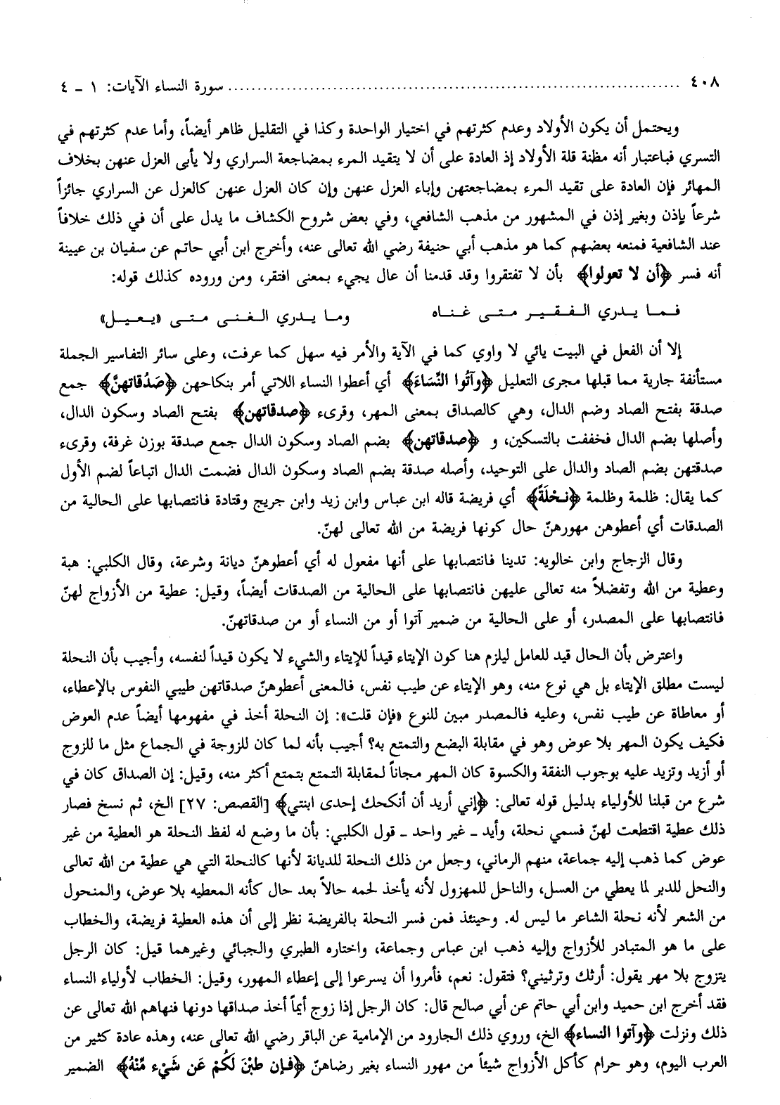 إلا أن الفعل في البيت يائي لا واوي كما في الآية والأمر فيه سهل كما عرفت، وعلى سائر التفاسير الجملة مستأنفة جارية مما قبلها مجرى التعليل وَآتُوا النِّساءَ أي أعطوا النساء اللاتي أمر بنكاحهن صَدُقاتِهِنَّ جمع صدقة بفتح الصاد وضم الدال، وهي كالصداق بمعنى المهر، وقرئ صَدُقاتِهِنَّ بفتح الصاد وسكون الدال، وأصلها بضم الدال فخففت بالتسكين، وصَدُقاتِهِنَّ بضم الصاد وسكون الدال جمع صدقة بوزن غرفة، وقرئ صدقتهن بضم الصاد والدال على التوحيد، وأصله صدقة بضم الصاد وسكون الدال فضمت الدال اتباعا لضم الأول كما يقال: ظلمة وظلمة نِحْلَةً أي فريضة قاله ابن عباس وابن زيد وابن جريج وقتادة فانتصابها على الحالية من الصدقات أي أعطوهن مهورهنّ حال كونها فريضة من الله تعالى لهنّ.