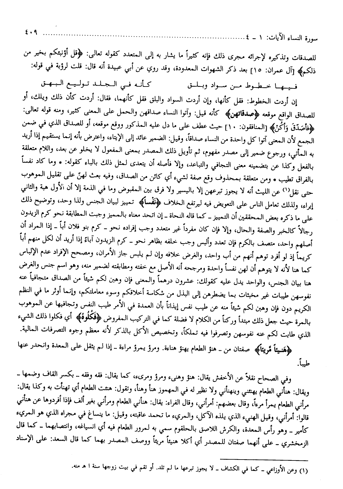 فَأَصَّدَّقَ وَأَكُنْ [المنافقون: 10] حيث عطف على ما دل عليه المذكور ووقع موقعه، أو للصداق الذي في ضمن الجمع لأن المعنى آتوا كل واحدة من النساء صداقا، وقيل: الضمير عائد إلى الإيتاء، واعترض بأنه إنما يستقيم إذا أريد به المأتي، ورجوع ضمير إلى مصدر مفهوم، ثم تأويل ذلك المصدر بمعنى المفعول لا يخلو عن بعد، واللام متعلقة بالفعل وكذا عن بتضمينه معنى التجافي والتباعد، وإلا فأصله أن يتعدى لمثل ذلك بالباء كقوله: وما كاد نفسا بالفراق تطيب ومن متعلقة بمحذوف وقع صفة لشيء أي كائن من الصداق، وفيه بعث لهنّ على تقليل الموهوب حتى نقل (¬1) عن الليث أنه لا يجوز تبرعهن إلا باليسير ولا فرق بين المقبوض وما في الذمة إلا أن الأول هبة والثاني إبراء، ولذلك تعامل الناس على التعويض فيه ليرتفع الخلاف نَفْساً تمييز لبيان الجنس ولذا وحد، وتوضيح ذلك على ما ذكره بعض المحققين أن التمييز- كما قاله النحاة- إن اتحد معناه بالمميز وجبت المطابقة نحو كرم الزيدون رجالا كالخبر والصفة والحال، وإلا فإن كان مفردا غير متعدد وجب إفراده نحو- كرم بنو فلان أبا- إذا المراد أن أصلهم واحد، متصف بالكرم فإن تعدد وألبس وجب خلفه بظاهر نحو- كرم الزيدون آباء إذا أريد أن لكل منهم أبا كريما إذ لو أفرد توهم أنهم من أب واحد، والغرض خلافه وإن لم يلبس جاز الأمران، ومصحح الإفراد عدم الإلباس كما هنا لأنه لا يتوهم أن لهن نفسا واحدة ومرجحه أنه الأصل مع خفته ومطابقته لضمير منه، وهو اسم جنس والغرض هنا بيان الجنس، والواحد يدل عليه كقولك: عشرون درهما والمعنى فإن وهبن لكم شيئا من الصداق متجافيا عنه نفوسهن طيبات غير مخبثات بما يضطرهن إلى البذل من شكاسة أخلاقكم وسوء معاملتكم، وإنما أوثر ما في النظم الكريم دون فإن وهبن لكم شيئا منه عن طيب نفس إيذانا بأن العمدة في الأمر طيب النفس وتجافيها عن الموهوب بالمرة حيث جعل ذلك مبتدأ وركنا من الكلام لا فضلة كما في التركيب المفروض فَكُلُوهُ أي فكلوا ذلك الشيء الذي طابت لكم عنه نفوسهن وتصرفوا فيه تملكا، وتخصيص الأكل بالذكر لأنه معظم وجوه التصرفات المالية.