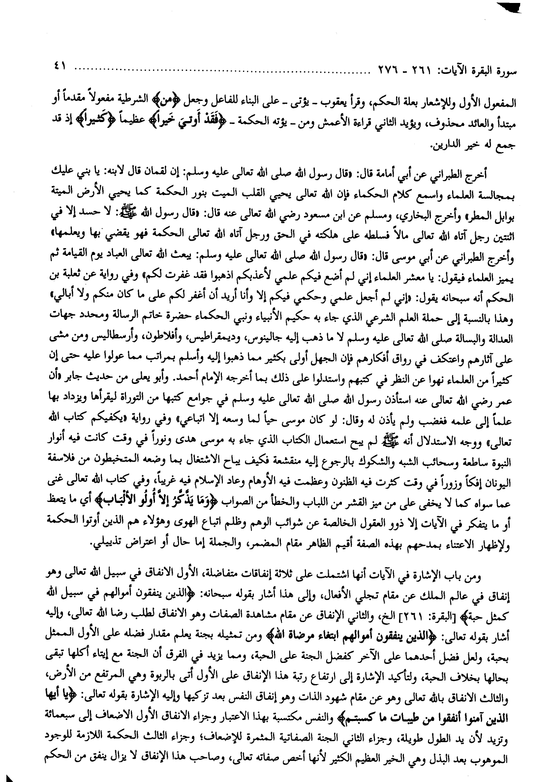 ومن باب الإشارة في الآيات أنها اشتملت على ثلاثة إنفاقات متفاضلة، الأول الانفاق في سبيل الله تعالى وهو إنفاق في عالم الملك عن مقام تجلي الأفعال، وإلى هذا أشار بقوله سبحانه: الَّذِينَ يُنْفِقُونَ أَمْوالَهُمْ فِي سَبِيلِ اللَّهِ كَمَثَلِ حَبَّةٍ [البقرة: 261] إلخ، والثاني الإنفاق عن مقام مشاهدة الصفات وهو الانفاق لطلب رضا الله تعالى، وإليه أشار بقوله تعالى: الَّذِينَ يُنْفِقُونَ أَمْوالَهُمُ ابْتِغاءَ مَرْضاتِ اللَّهِ ومن تمثيله بجنة يعلم مقدار فضله على الأول الممثل بحبة، ولعل فضل أحدهما على الآخر كفضل الجنة على الحبة، ومما يزيد في الفرق أن الجنة مع إيتاء أكلها تبقى بحالها بخلاف الحبة، ولتأكيد الإشارة إلى ارتفاع رتبة هذا الإنفاق على الأول أتى بالربوة وهي المرتفع من الأرض، والثالث الانفاق بالله تعالى وهو عن مقام شهود الذات وهو إنفاق النفس بعد تزكيها وإليه الإشارة بقوله تعالى: يا أَيُّهَا الَّذِينَ آمَنُوا أَنْفِقُوا مِنْ طَيِّباتِ ما كَسَبْتُمْ والنفس مكتسبة بهذا الاعتبار وجزاء الانفاق الأول الأضعاف إلى سبعمائة وتزيد لأن يد الطول طويلة، وجزاء الثاني الجنة الصفاتية المثمرة للإضعاف وجزاء الثالث الحكمة اللازمة للوجود الموهوب بعد البذل وهي الخير العظيم الكثير لأنها أخص صفاته تعالى، وصاحب هذا الإنفاق لا يزال ينفق من الحكم