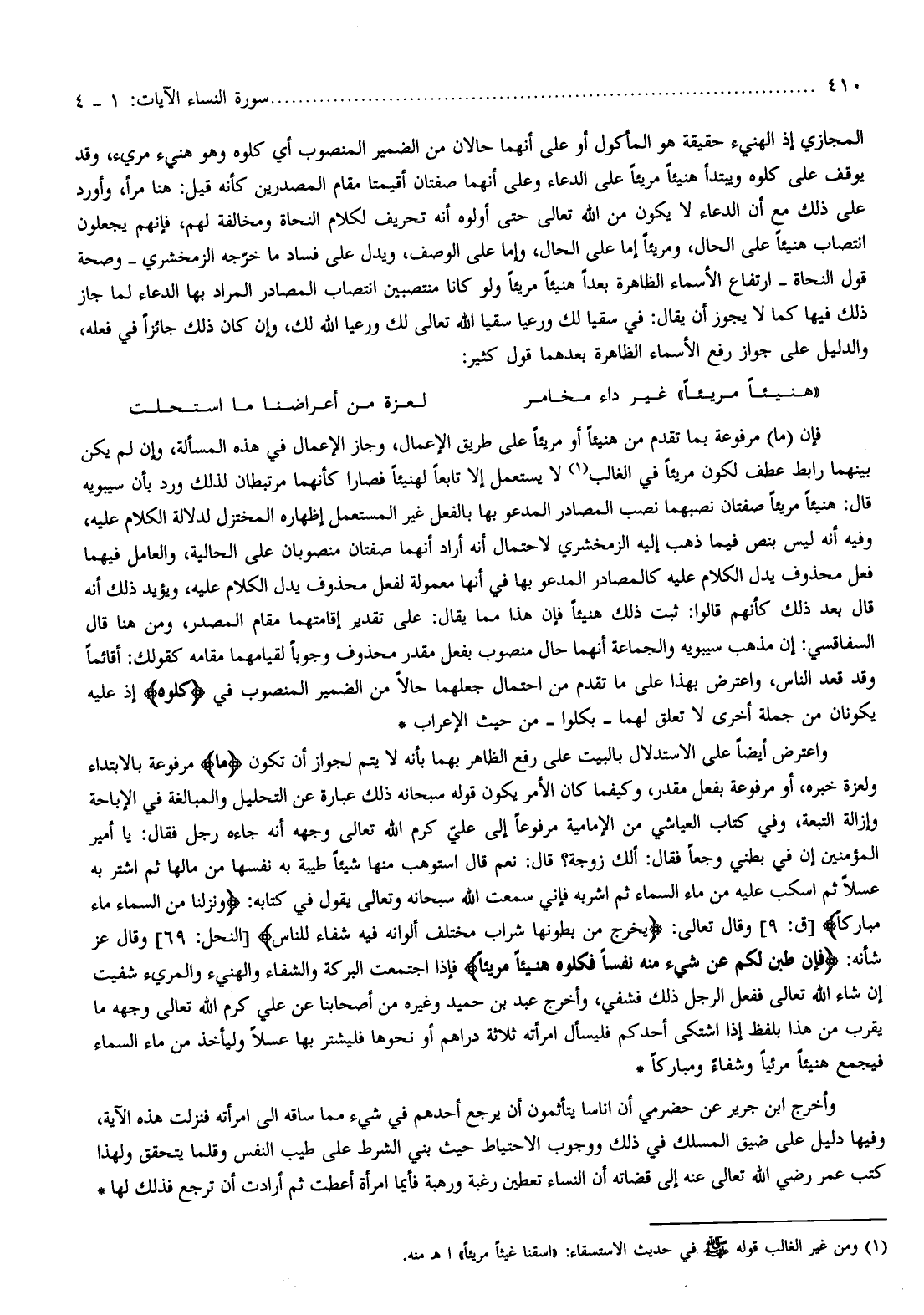 المجازي إذ الهنيء حقيقة هو المأكول أو على أنهما حالان من الضمير المنصوب أي كلوه وهو هنيء مريء، وقد يوقف على كلوه ويبتدأ هنيئا مريئا على الدعاء وعلى أنهما صفتان أقيمتا مقام المصدرين كأنه قيل: هنا مرأ، وأورد على ذلك مع أن الدعاء لا يكون من الله تعالى حتى أولوه أنه تحريف لكلام النحاة ومخالفة لهم، فإنهم يجعلون انتصاب هنيئا على الحال، ومريئا إما على الحال، وإما على الوصف، ويدل على فساد ما خرّجه الزمخشري- وصحة قول النحاة- ارتفاع الأسماء الظاهرة بعدا هنيئا مرئيا ولو كانا منتصبين انتصاب المصادر المراد بها الدعاء لما جاز ذلك فيها كما لا يجوز أن يقال: في سقيا لك ورعيا سقيا الله تعالى لك ورعيا الله لك، وإن كان ذلك جائزا في فعله، والدليل على جواز رفع الأسماء الظاهرة بعدهما قول كثير:
