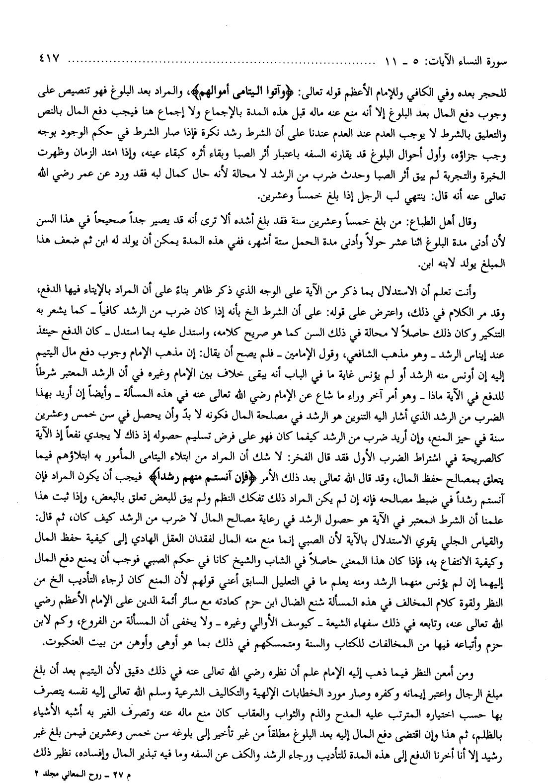 ومن أمعن النظر فيما ذهب إليه الإمام علم أن نظره رضي الله تعالى عنه في ذلك دقيق لأن اليتيم بعد أن بلغ مبلغ الرجال واعتبر إيمانه وكفره وصار مورد الخطابات الإلهية والتكاليف الشرعية وسلم الله تعالى إليه نفسه يتصرف بها حسب اختياره المترتب عليه المدح والذم والثواب والعقاب كان منع ماله عنه وتصرف الغير به أشبه الأشياء بالظلم، ثم هذا وإن اقتضى دفع المال إليه بعد البلوغ مطلقا من غير تأخير إلى بلوغه سن خمس وعشرين فيمن بلغ غير رشيد إلا أنا أخرنا الدفع إلى هذه المدة للتأديب ورجاء الرشد والكف عن السفه وما فيه تبذير المال وإفساده، نظير ذلك