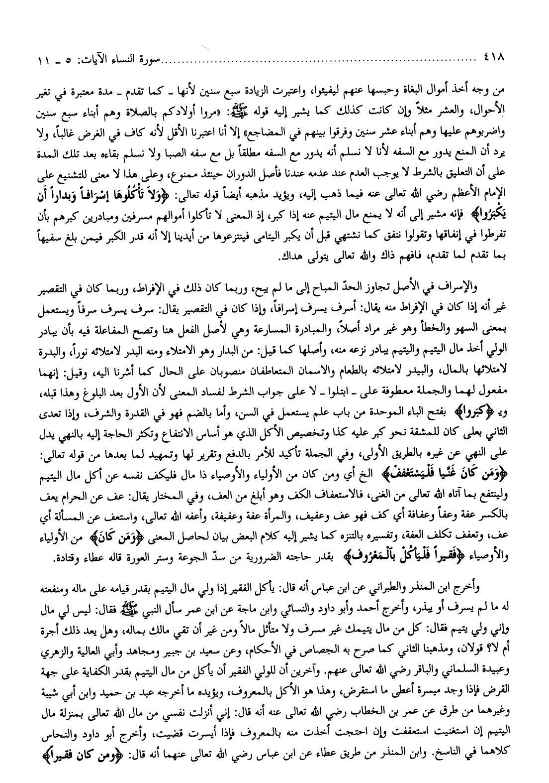 والإسراف في الأصل تجاوز الحدّ المباح إلى ما لم يبح، وربما كان ذلك في الإفراط، وربما كان في التقصير غير أنه إذا كان في الإفراط منه يقال: أسرف يسرف إسرافا، وإذا كان في التقصير يقال: سرف يسرف سرفا ويستعمل بمعنى السهو والخطأ وهو غير مراد أصلا، والمبادرة المسارعة وهي لأصل الفعل هنا وتصح المفاعلة فيه بأن يبادر الولي أخذ مال اليتيم واليتيم يبادر نزعه منه، وأصلها كما قيل: من البدار وهو الامتلاء ومنه البدر لامتلائه نورا، والبدرة لامتلائها بالمال، والبيدر لامتلائه بالطعام والاسمان المتعاطفان منصوبان على الحال كما أشرنا اليه، وقيل: إنهما مفعول لهما والجملة معطوفة على- ابتلوا- لا على جواب الشرط لفساد المعنى لأن الأول بعد البلوغ وهذا قبله، ويَكْبَرُوا بفتح الباء الموحدة من باب علم يستعمل في السن، وأما بالضم فهو في القدرة والشرف، وإذا تعدى الثاني بعلى كان للمشقة نحو كبر عليه كذا وتخصيص الأكل الذي هو أساس الانتفاع وتكثر الحاجة إليه بالنهي يدل على النهي عن غيره بالطريق الأولى، وفي الجملة تأكيد للأمر بالدفع وتقرير لها وتمهيد لما بعدها من قوله تعالى:
