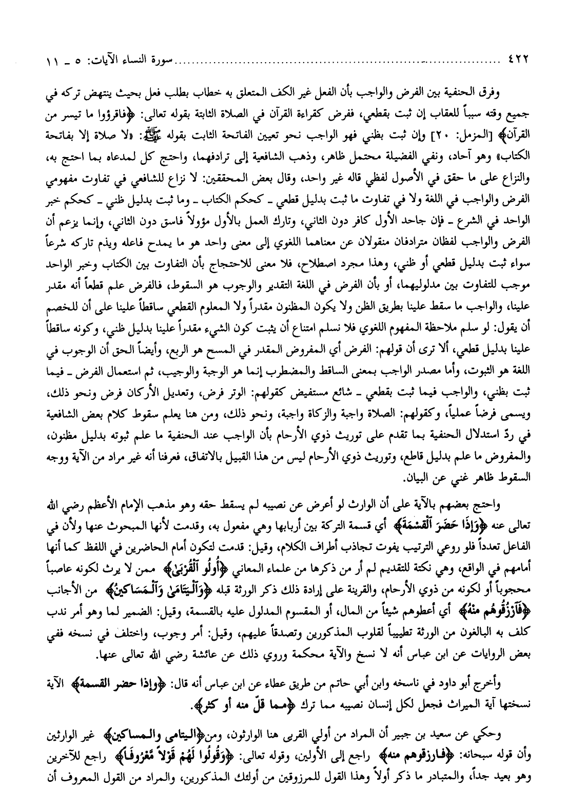 وهو آحاد، ونفي الفضيلة محتمل ظاهر، وذهب الشافعية إلى ترادفهما، واحتج كل لمدعاه بما احتج به، والنزاع على ما حقق في الأصول لفظي قاله غير واحد، وقال بعض المحققين: لا نزاع للشافعي في تفاوت مفهومي الفرض والواجب في اللغة ولا في تفاوت ما ثبت بدليل قطعي- كحكم الكتاب- وما ثبت بدليل ظني- كحكم خبر الواحد في الشرع- فإن جاحد الأول كافر دون الثاني، وتارك العمل بالأول مؤولا فاسق دون الثاني، وإنما يزعم أن الفرض والواجب لفظان مترادفان منقولان عن معناهما اللغوي إلى معنى واحد هو ما يمدح فاعله ويذم تاركه شرعا سواء ثبت بدليل قطعي أو ظني، وهذا مجرد اصطلاح، فلا معنى للاحتجاج بأن التفاوت بين الكتاب وخبر الواحد موجب للتفاوت بين مدلوليهما، أو بأن الفرض في اللغة التقدير والوجوب هو السقوط، فالفرض علم قطعا أنه مقدر علينا، والواجب ما سقط علينا بطريق الظن ولا يكون المظنون مقدرا ولا المعلوم القطعي ساقطا علينا على أن للخصم أن يقول: لو سلم ملاحظة المفهوم اللغوي فلا نسلم امتناع أن يثبت كون الشيء مقدرا علينا بدليل ظني، وكونه ساقطا علينا بدليل قطعي، ألا ترى أن قولهم: الفرض أي المفروض المقدر في المسح هو الربع، وأيضا الحق أن الوجوب في اللغة هو الثبوت، وأما مصدر الواجب بمعنى الساقط والمضطرب إنما هو الوجبة والوجيب، ثم استعمال الفرض- فيما ثبت بظني، والواجب فيما ثبت بقطعي- شائع مستفيض كقولهم: الوتر فرض، وتعديل الأركان فرض ونحو ذلك، ويسمى فرضا عمليا، وكقولهم: الصلاة واجبة والزكاة واجبة، ونحو ذلك، ومن هنا يعلم سقوط كلام بعض الشافعية في ردّ استدلال الحنفية بما تقدم على توريث ذوي الأرحام بأن الواجب عند الحنفية ما علم ثبوته بدليل مظنون، والمفروض ما علم بدليل قاطع، وتوريث ذوي الأرحام ليس من هذا القبيل بالاتفاق، فعرفنا أنه غير مراد من الآية ووجه السقوط ظاهر غني عن البيان.
