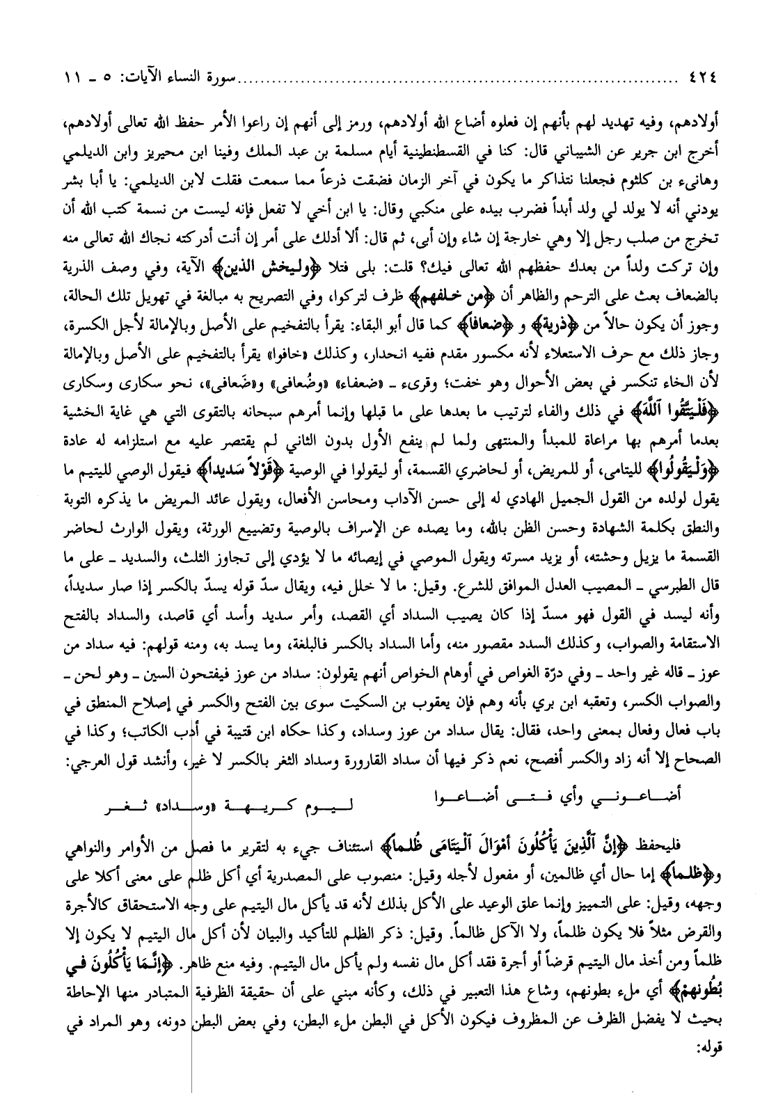 أولادهم، وفيه تهديد لهم بأنهم إن فعلوه أضاع الله أولادهم، ورمز إلى أنهم إن راعوا الأمر حفظ الله تعالى أولادهم، أخرج ابن جرير عن الشيباني قال: كنا في القسطنطينية أيام مسلمة بن عبد الملك وفينا ابن محيريز وابن الديلمي وهانىء بن كلثوم فجعلنا نتذاكر ما يكون في آخر الزمان فضقت ذرعا مما سمعت فقلت لابن الديلمي: يا أبا بشر يودني أنه لا يولد لي ولد أبدا فضرب بيده على منكبي وقال: يا ابن أخي لا تفعل فإنه ليست من نسمة كتب الله أن تخرج من صلب رجل إلا وهي خارجة إن شاء وإن أبى، ثم قال: ألا أدلك على أمر إن أنت أدركته نجاك الله تعالى منه وإن تركت ولدا من بعدك حفظهم الله تعالى فيك؟ قلت: بلى فتلا وَلْيَخْشَ الَّذِينَ الآية، وفي وصف الذرية بالضعاف بعث على الترحم والظاهر أن مِنْ خَلْفِهِمْ ظرف لتركوا، وفي التصريح به مبالغة في تهويل تلك الحالة، وجوز أن يكون حالا من ذُرِّيَّةً وضِعافاً كما قال أبو البقاء: يقرأ بالتفخيم على الأصل وبالإمالة لأجل الكسرة، وجاز ذلك مع حرف الاستعلاء لأنه مكسور مقدم ففيه انحدار، وكذلك «خافوا» يقرأ بالتفخيم على الأصل وبالإمالة لأن الخاء تنكسر في بعض الأحوال وهو خفت وقرئ- «ضعفاء» «وضعافى» و «ضعافى» ، نحو سكارى وسكارى فَلْيَتَّقُوا اللَّهَ في ذلك والفاء لترتيب ما بعدها على ما قبلها وإنما أمرهم سبحانه بالتقوى التي هي غاية الخشية بعد ما أمرهم بها مراعاة للمبدأ والمنتهى ولما لم ينفع الأول بدون الثاني لم يقتصر عليه مع استلزامه له عادة وَلْيَقُولُوا لليتامى، أو للمريض، أو لحاضري القسمة، أو ليقولوا في الوصية قَوْلًا سَدِيداً فيقول الوصي لليتيم ما يقول لولده من القول الجميل الهادي له إلى حسن الآداب ومحاسن الأفعال، ويقول عائد المريض ما يذكره التوبة والنطق بكلمة الشهادة وحسن الظن بالله، وما يصده عن الإسراف بالوصية وتضييع الورثة، ويقول الوارث لحاضر القسمة ما يزيل وحشته، أو يزيد مسرته ويقول الموصي في إيصائه ما لا يؤدي إلى تجاوز الثلث، والسديد- على ما قال الطبرسي- المصيب العدل الموافق للشرع. وقيل: ما لا خلل فيه، ويقال سدّ قوله يسدّ بالكسر إذا صار سديدا، وأنه ليسد في القول فهو مسدّ إذا كان يصيب السداد أي القصد، وأمر سديد وأسد أي قاصد، والسداد بالفتح الاستقامة والصواب، وكذلك السدد مقصور منه، وأما السداد بالكسر فالبلغة، وما يسد به، ومنه قولهم: فيه سداد من عوز- قاله غير واحد- وفي درّة الغواص في أوهام الخواص أنهم يقولون: سداد من عوز فيفتحون السين- وهو لحن- والصواب الكسر، وتعقبه ابن بري بأنه وهم فإن يعقوب بن السكيت سوى بين الفتح والكسر في إصلاح المنطق في باب فعال وفعال بمعنى واحد، فقال: يقال سداد من عوز وسداد، وكذا حكاه ابن قتيبة في أدب الكاتب وكذا في الصحاح إلا أنه زاد والكسر أفصح، نعم ذكر فيها أن سداد القارورة وسداد الثغر بالكسر لا غير، وأنشد قول العرجي: