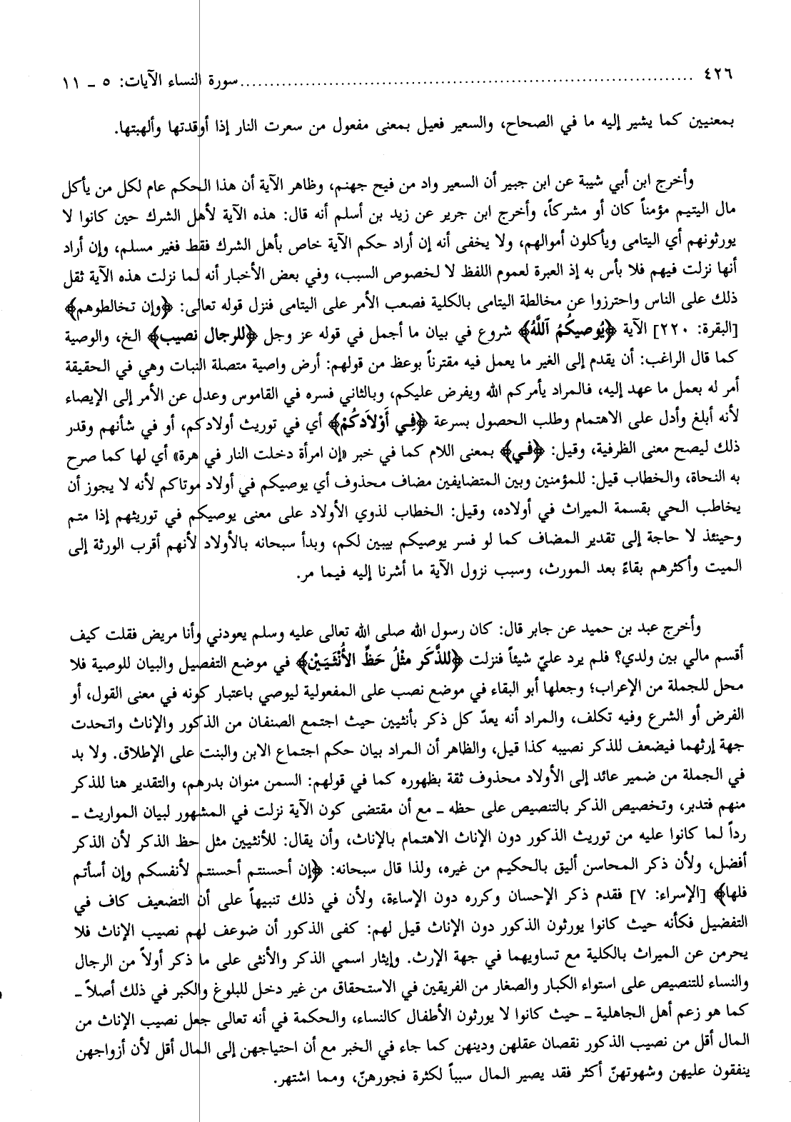وأخرج ابن أبي شيبة عن ابن جبير أن السعير واد من فيح جهنم، وظاهر الآية أن هذا الحكم عام لكل من يأكل مال اليتيم مؤمنا كان أو مشركا، وأخرج ابن جرير عن زيد بن أسلم أنه قال: هذه الآية لأهل الشرك حين كانوا لا يورثونهم أي اليتامى ويأكلون أموالهم، ولا يخفى أنه إن أراد حكم الآية خاص بأهل الشرك فقط فغير مسلم، وإن أراد أنها نزلت فيهم فلا بأس به إذ العبرة لعموم اللفظ لا لخصوص السبب، وفي بعض الأخبار أنه لما نزلت هذه الآية ثقل ذلك على الناس واحترزوا عن مخالطة اليتامى بالكلية فصعب الأمر على اليتامى فنزل قوله تعالى: وَإِنْ تُخالِطُوهُمْ [البقرة: 220] الآية يُوصِيكُمُ اللَّهُ شروع في بيان ما أجمل في قوله عز وجل لِلرِّجالِ نَصِيبٌ إلخ، والوصية كما قال الراغب: أن يقدم إلى الغير ما يعمل فيه مقترنا بوعظ من قولهم: أرض واصية متصلة النبات وهي في الحقيقة أمر له بعمل ما عهد إليه، فالمراد يأمركم الله ويفرض عليكم، وبالثاني فسره في القاموس وعدل عن الأمر إلى الإيصاء لأنه أبلغ وأدل على الاهتمام وطلب الحصول بسرعة فِي أَوْلادِكُمْ أي في توريث أولادكم، أو في شأنهم وقدر ذلك ليصح معنى الظرفية، وقيل: فِي بمعنى اللام كما