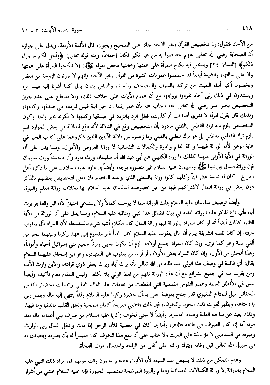والشيعة أيضا قد خصصوا عمومات كثيرة من القرآن بخبر الآحاد فإنهم لا يورثون الزوجة من العقار ويخصون أكبر أبناء الميت من تركته بالسيف والمصحف والخاتم واللباس بدون بدل كما أشرنا إليه فيما مر، ويستندون في ذلك إلى آحاد تفردوا بروايتها مع أن عموم الآيات على خلاف ذلك، والاحتجاج على عدم جواز التخصيص بخبر عمر رضي الله تعالى عنه مجاب عنه بأن عمر إنما رد خبر ابنة قيس لتردده في صدقها وكذبها، ولذلك قال بقول امرأة لا ندري أصدقت أم كذبت، فعلل الرد بالتردد في صدقها وكذبها لا بكونه خبر واحد وكون التخصيص يلزم منه ترك القطعي بالظني مردود بأن التخصيص وقع في الدلالة لأنه دفع للدلالة في بعض الموارد فلم يلزم ترك القطعي بالظني بل هو ترك للظني بالظني وما زعموه من دلالة الآيتين اللتين ذكروهما على كذب الخبر في غاية الوهن لأن الوراثة فيهما وراثة العلم والنبوة والكمالات النفسانية لا وراثة العروض والأموال، ومما يدل على أن الوراثة في الآية الأولى منهما كذلك ما