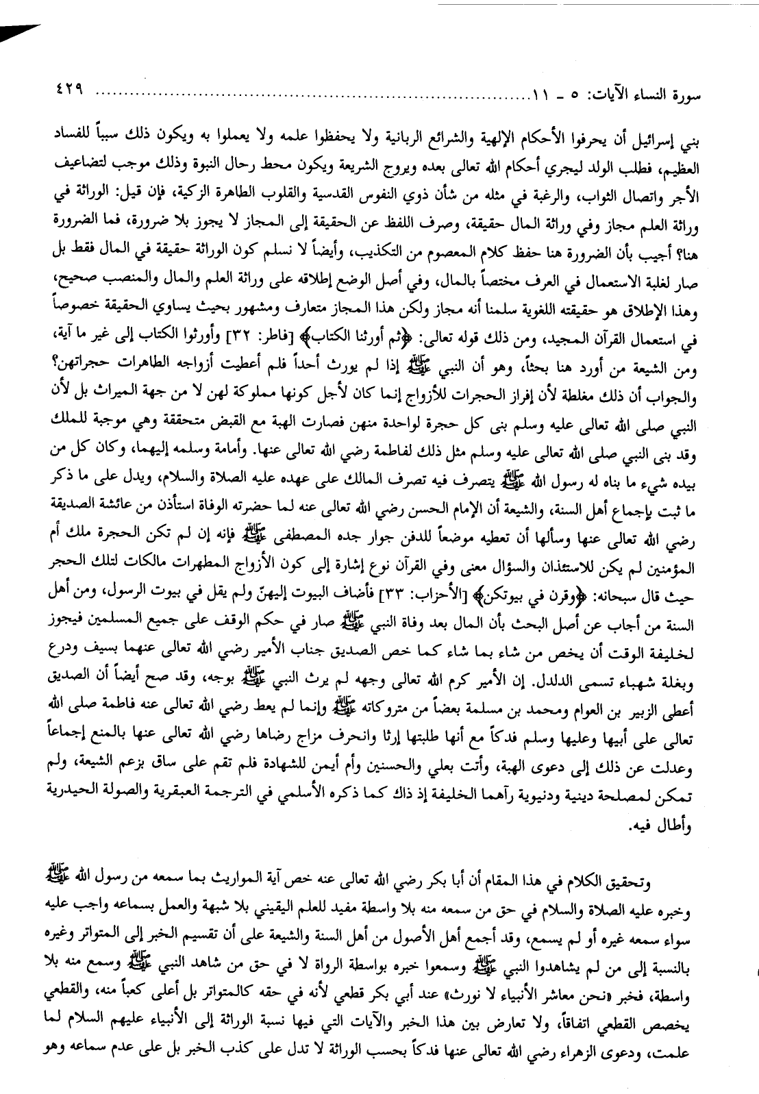 وتحقيق الكلام في هذا المقام أن أبا بكر رضي الله تعالى عنه خص آية المواريث بما سمعه من رسول الله صلّى الله عليه وسلم وخبره عليه الصلاة والسلام في حق من سمعه منه بلا واسطة مفيد للعلم اليقيني بلا شبهة والعمل بسماعة واجب عليه سوء سمعه غيره أو لم يسمع، وقد أجمع أهل الأصول من أهل السنة والشيعة على أن تقسيم الخبر إلى المتواتر وغيره بالنسبة إلى من لم يشاهدوا النبي صلّى الله عليه وسلم وسمعوا خبره بواسطة الرواة لا في حق من شاهد النبي صلّى الله عليه وسلم وسمع منه بلا واسطة،