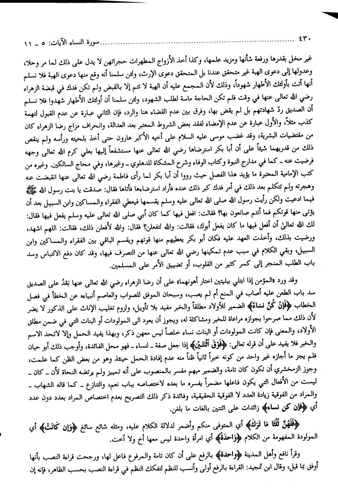 غير مخل بقدرها ورفعة شأنها ومزيد علمها، وكذا أخذ الأزواج المطهرات حجراتهن لا يدل على ذلك لما مر وحلا، وعدولها إلى دعوى الهبة غير متحقق عندنا بل المتحقق دعوى الإرث، ولئن سلمنا أنه وقع منها دعوى الهبة فلا نسلم أنها أتت بأولئك الأطهار شهودا، وذلك لأن المجمع عليه أن الهبة لا تتم إلا بالقبض ولم تكن فدك في قبضة الزهراء رضي الله تعالى عنها في وقت فلم تكن الحاجة ماسة لطلب الشهود، ولئن سلمنا أن أولئك الأطهار شهدوا فلا نسلم أن الصديق ردّ شهادتهم بل لم يقض بها، وفرق بين عدم القضاء هنا والرد، فإن الثاني عبارة عن عدم القبول لتهمة كذب مثلا، والأول عبارة عن عدم الإمضاء لفقد بعض الشروط المعتبر بعد العدالة، وانحراف مزاج رضا الزهراء كان من مقتضيات البشرية، وقد غضب موسى عليه السلام على أخيه الأكبر هارون حتى أخذ بلحيته ورأسه ولم ينقص ذلك من قدريهما شيئا على أن أبا بكر استرضاها رضي الله تعالى عنها مستشفعا إليها بعلي كرم الله تعالى وجهه فرضيت عنه- كما في مدارج النبوة وكتاب الوفاء وشرح المشكاة للدهلوي- وغيرها، وفي محاج السالكين. وغيره من كتب الإمامية المعتبرة ما يؤيد هذا الفصل حيث