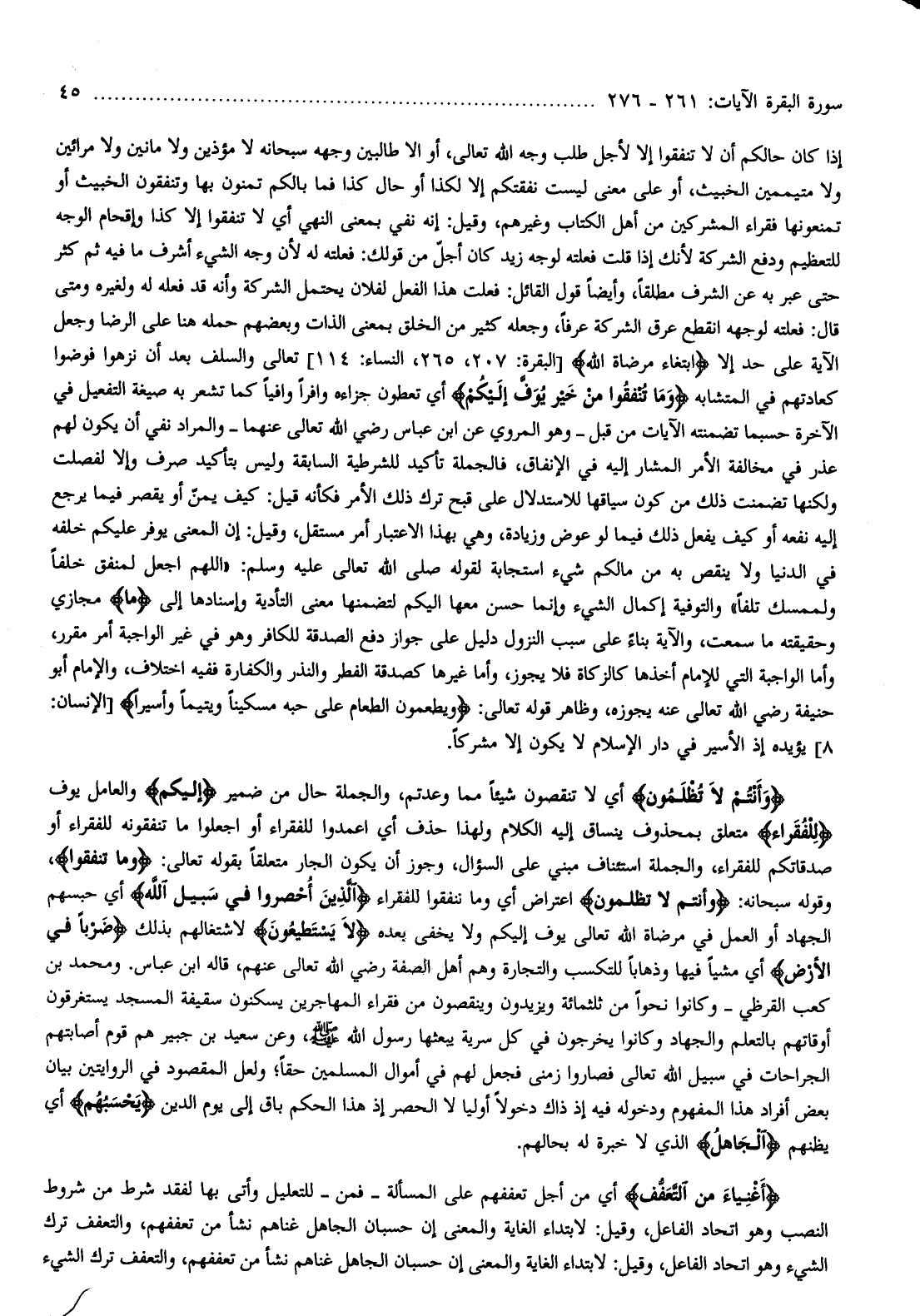 وَأَنْتُمْ لا تُظْلَمُونَ أي لا تنقصون شيئا مما وعدتم، والجملة حال من ضمير إِلَيْكُمْ والعامل يوف لِلْفُقَراءِ متعلق بمحذوف ينساق إليه الكلام ولهذا حذف أي اعمدوا للفقراء أو اجعلوا ما تنفقونه للفقراء أو صدقاتكم للفقراء، والجملة استئناف مبني على السؤال، وجوز أن يكون الجار متعلقا بقوله تعالى: وَما تُنْفِقُوا، وقوله سبحانه: وَأَنْتُمْ لا تُظْلَمُونَ اعتراض أي وما ننفقوا للفقراء الَّذِينَ أُحْصِرُوا فِي سَبِيلِ اللَّهِ أي حبسهم الجهاد أو العمل في مرضاة الله تعالى يوف إليكم ولا يخفى بعده لا يَسْتَطِيعُونَ لاشتغالهم بذلك ضَرْباً فِي الْأَرْضِ أي مشيا فيها وذهابا للتكسب والتجارة وهم أهل الصفة رضي الله تعالى عنهم، قاله ابن عباس. ومحمد بن كعب القرظي- وكانوا نحوا من ثلاثمائة ويزيدون وينقصون من فقراء المهاجرين يسكنون سقيفة المسجد يستغرقون أوقاتهم بالتعلم والجهاد وكانوا يخرجون في كل سرية يبعثها رسول الله صلّى الله عليه وسلم، وعن سعيد بن جبير هم قوم أصابتهم الجراحات في سبيل الله تعالى فصاروا زمنى فجعل لهم في أموال المسلمين حقا ولعل المقصود في الروايتين بيان بعض أفراد هذا المفهوم ودخوله فيه إذ ذاك دخولا أوليا لا الحصر إذ هذا الحكم باق إلى يوم الدين يَحْسَبُهُمُ أي يظنهم الْجاهِلُ الذي لا خبرة له بحالهم.