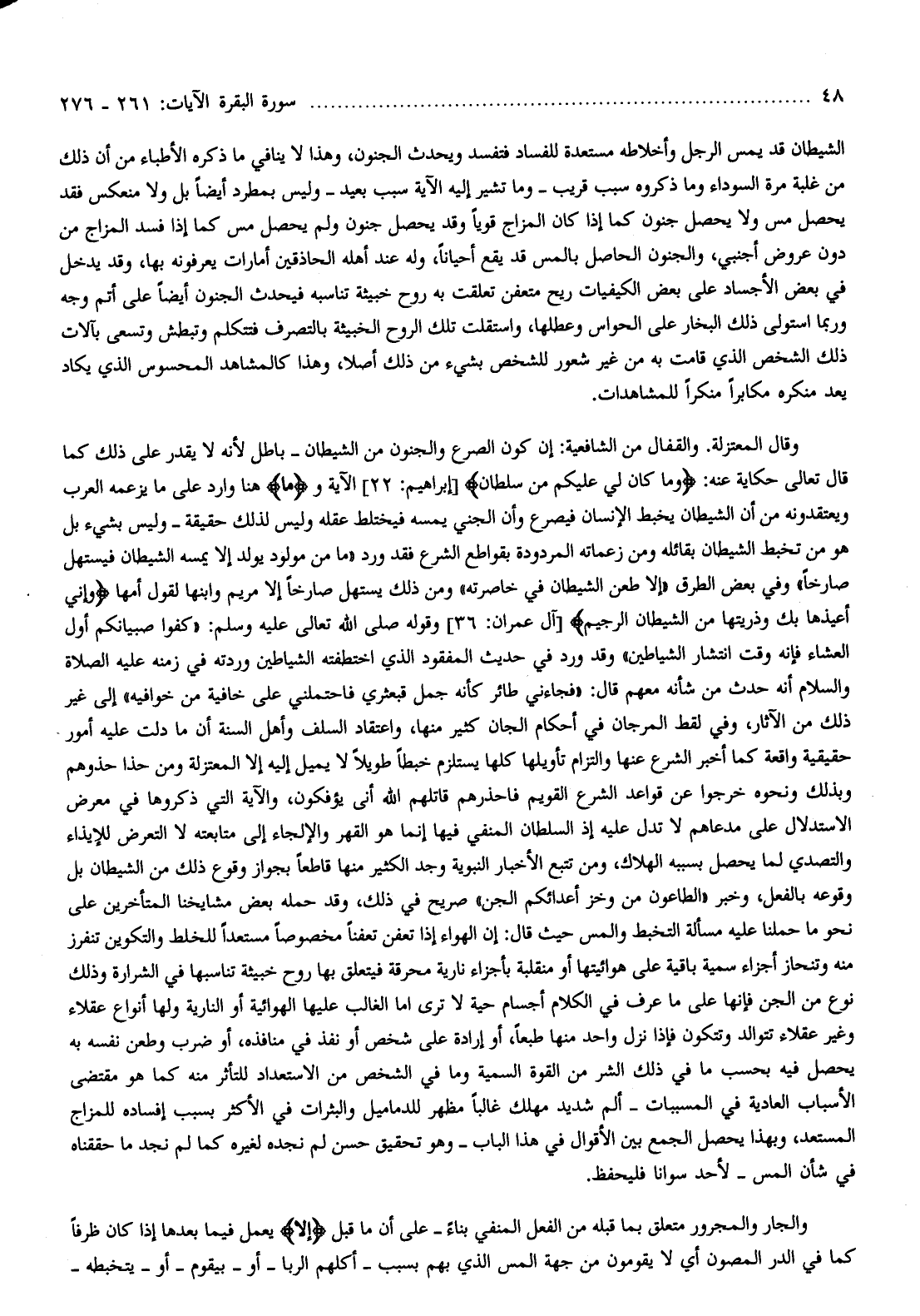 إلى غير ذلك من الآثار، وفي لقط المرجان في أحكام الجان كثير منها، واعتقاد السلف وأهل السنة أن ما دلت عليه أمور حقيقية واقعة كما أخبر الشرع عنها والتزام تأويلها كلها يستلزم خبطا طويلا لا يميل إليه إلا المعتزلة ومن حذا حذوهم وبذلك ونحوه خرجوا عن قواعد الشرع القويم فاحذرهم قاتلهم الله أنى يؤفكون، والآية التي ذكروها في معرض الاستدلال على مدعاهم لا تدل عليه إذ السلطان المنفي فيها إنما هو القهر والإلجاء إلى متابعته لا التعرض للإيذاء والتصدي لما يحصل بسببه الهلاك، ومن تتبع الأخبار النبوية وجد الكثير منها قاطعا بجواز وقوع ذلك من الشيطان بل وقوعه بالفعل،