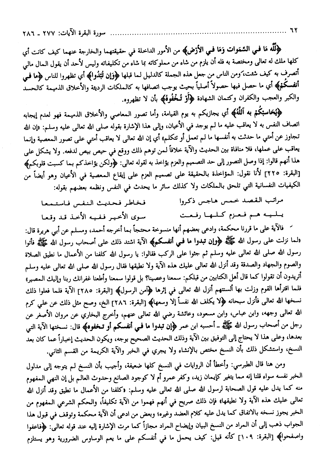ومن هنا قال الطبرسي: وأخطأ أن الروايات في النسخ كلها ضعيفة، وأجيب بأن النسخ لم يتوجه إلى مدلول الخبر نفسه سواء قلنا إنه مما يتغير كإيمان زيد، وكفر عمرو أم لا كوجود الصانع وحدوث العالم بل إن النهي المفهوم منه كما يدل عليه قول الصحابة لرسول الله صلى الله تعالى عليه وسلم: «كلفنا من الأعمال ما نطيق وقد أنزل الله تعالى عليك هذه الآية ولا نطيقها» فإن ذلك صريح في أنهم فهموا من الآية تكليفا، والحكم الشرعي المفهوم من الخبر يجوز نسخه بالاتفاق كما يدل عليه كلام العضد وغيره وبعض من ادعى أن الآية محكمة وتوقف في قبول هذا الجواب ذهب إلى أن المراد من النسخ البيان وإيضاح المراد مجازا كما مرت الإشارة إليه عند قوله تعالى: فَاعْفُوا وَاصْفَحُوا [البقرة: 109] كأنه قيل: كيف يحمل ما في أنفسكم على ما يعم الوساوس الضرورية وهو يستلزم