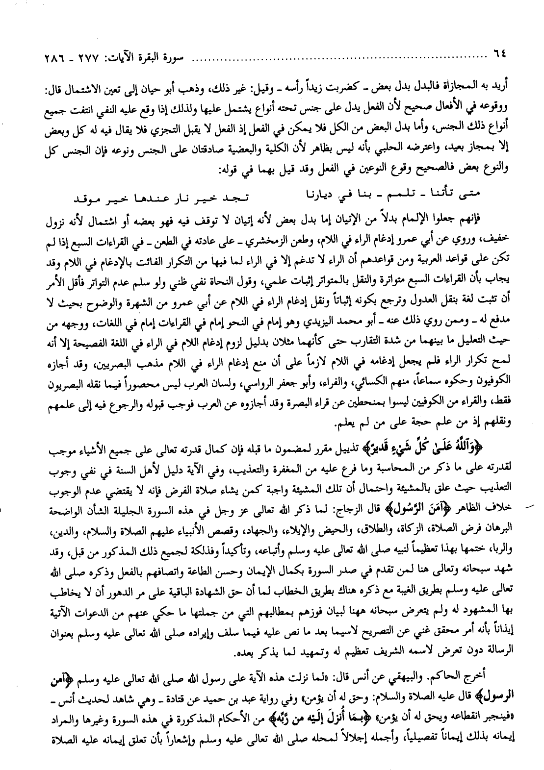 وَاللَّهُ عَلى كُلِّ شَيْءٍ قَدِيرٌ تذييل مقرر لمضمون ما قبله فإن كمال قدرته تعالى على جميع الأشياء موجب لقدرته على ما ذكر من المحاسبة وما فرع عليه من المغفرة والتعذيب، وفي الآية دليل لأهل السنة في نفي وجوب التعذيب حيث علق بالمشيئة واحتمال أن تلك المشيئة واجبة كمن يشاء صلاة الفرض فإنه لا يقتضي عدم الوجوب خلاف الظاهر آمَنَ الرَّسُولُ قال الزجاج: لما ذكر الله تعالى عز وجل في هذه السورة الجليلة الشأن الواضحة البرهان فرض الصلاة، الزكاة، والطلاق، والحيض والإيلاء، والجهاد، وقصص الأنبياء عليهم الصلاة والسلام، والدين، والربا، ختمها بهذا تعظيما لنبيه صلى الله تعالى عليه وسلم وأتباعه، وتأكيدا وفذلكة لجميع ذلك المذكور من قبل، وقد شهد سبحانه وتعالى هنا لمن تقدم في صدر السورة بكمال الإيمان وحسن الطاعة واتصافهم بالفعل وذكره صلى الله تعالى عليه وسلم بطريق الغيبة مع ذكره هناك بطريق الخطاب لما أن حق الشهادة الباقية على مر الدهور أن لا يخاطب بها المشهود له ولم يتعرض سبحانه هاهنا لبيان فوزهم بمطالبهم التي من جملتها ما حكي عنهم من الدعوات الآتية إيذانا بأنه أمر محقق غني عن التصريح لا سيما بعد ما نص عليه فيما سلف وإيراده صلى الله تعالى عليه وسلم بعنوان الرسالة دون تعرض لاسمه الشريف تعظيم له وتمهيد لما يذكر بعده.