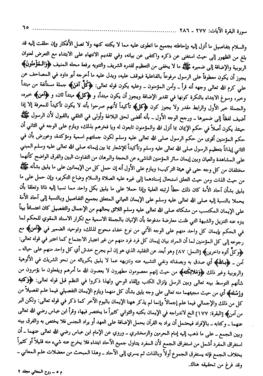 وَكُلٌّ أَتَوْهُ داخِرِينَ [النمل: 87] وهو أبعد عن التقليد الذي هو إن لم يجرح خدش أي كل واحد منهم على حياله- آمن- بِاللَّهِ أي صدق به وبصفاته ونفي التشبيه عنه وتنزيهه عما لا يليق بكبريائه من نحو الشريك في الألوهية والربوبية وغير ذلك وَمَلائِكَتِهِ من حيث إنهم معصومون مطهرون لا يعصون الله ما أمرهم ويفعلون ما يؤمرون من شأنهم التوسط بينه تعالى وبين الرسل بإنزال الكتب وإلقاء الوحي ولهذا ذكروا في النظم قبل قوله تعالى: وَكُتُبِهِ وَرُسُلِهِ أي من حيث مجيئهما منه تعالى على وجه يليق بشأن كل منهما ويلزم الإيمان التفصيلي فيما علم تفصيلا من كل من ذلك والإجمالي فيما علم إجمالا وإنما لم يذكر هاهنا الإيمان باليوم الآخر كما ذكر في قوله تعالى: وَلكِنَّ الْبِرَّ مَنْ آمَنَ [البقرة: 177] إلخ لاندراجه في الإيمان بكتبه والثواني كثيرا ما يختصر فيها، وقرأ ابن عباس رضي الله تعالى عنهما- وكتابه- بالإفراد فيحتمل أن يراد به القرآن بحمل الإضافة على العهد أو يراد الجنس فلا يختص به والفرق بينه وبين الجمع- على ما ذهب إليه إمام الحرمين والزمخشري- وروي عن الإمام ابن عباس رضي الله تعالى عنهما- أن استغراق المفرد أشمل من استغراق الجمع لأن المفرد يتناول جميع الآحاد ابتداء فلا يخرج عنه شيء منه قليلا أو كثيرا بخلاف الجمع فإنه يستغرق الجموع أولا وبالذات ثم يسري إلى الآحاد- وهذا المبحث من معضلات علم المعاني- وقد فرغ من تحقيقه هناك.