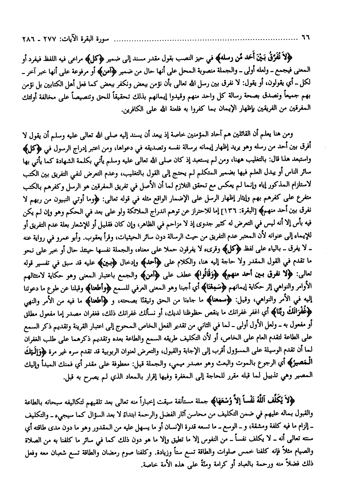 لا يُكَلِّفُ اللَّهُ نَفْساً إِلَّا وُسْعَها جملة مستأنفة سيقت إخبارا منه تعالى بعد تلقيهم لتكاليفه سبحانه بالطاعة والقبول بماله عليهم في ضمن التكليف من محاسن آثار الفضل والرحمة ابتداء لا بعد السؤال كما سيجيء- والتكليف- إلزام ما فيه كلفة ومشقة، والوسع- ما تسعه قدرة الإنسان أو ما يسهل عليه من المقدور وهو ما دون مدى طاقته أي سنته تعالى أنه- لا يكلف نفسا- من النفوس إلا ما تطيق وإلا ما هو دون ذلك كما في سائر ما كلفنا به من الصلاة والصيام مثلا فإنه كلفنا خمس صلوات والطاقة تسع ستا وزيادة. وكلفنا صوم رمضان والطاقة تسع شعبان معه وفعل ذلك فضلا منه ورحمة بالعباد أو كرامة ومنّة على هذه الأمة خاصة.